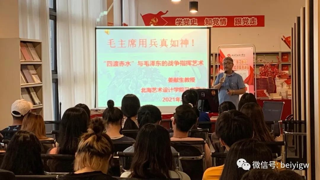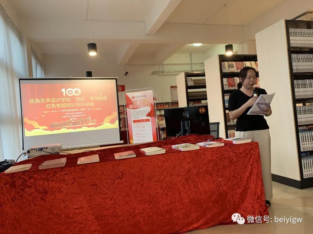 为迎接中国共产党成立100周年,深入学习贯彻落实习近平总书记在党史学习教育动员大会上的重要讲话精神,5月14日晚7点,由北海艺术设计学院图书馆与马克思主义学院联合推出的“四史”学习教育红色知识专题系列讲座在学校图书馆红色书籍阅读角开讲。