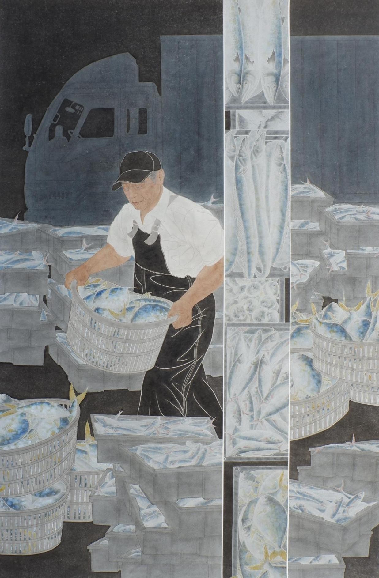 《一渔一网鱼》 马梅花 工笔设色 120cm×180cm 2023年