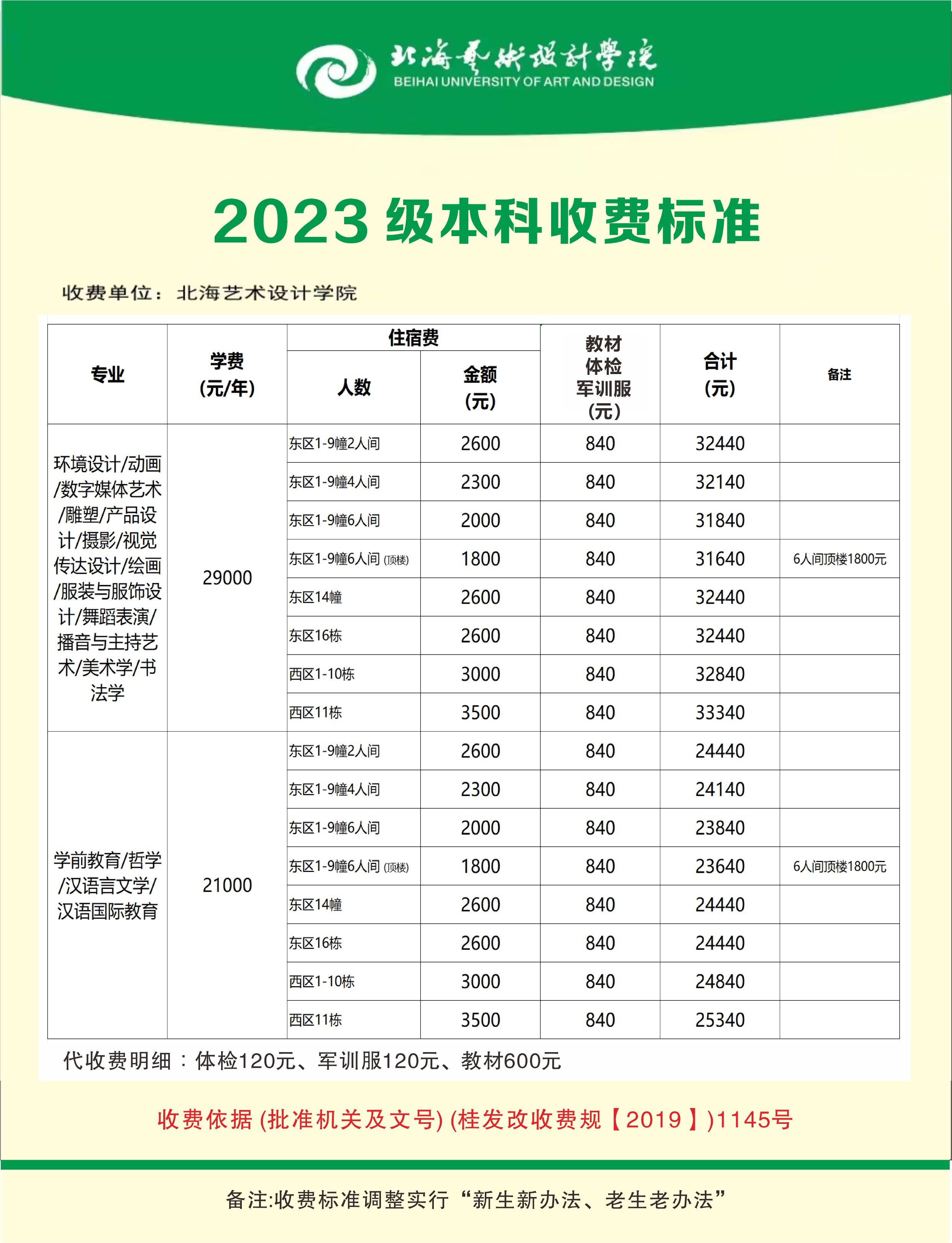 北海艺术设计学院2023级本科收费标准