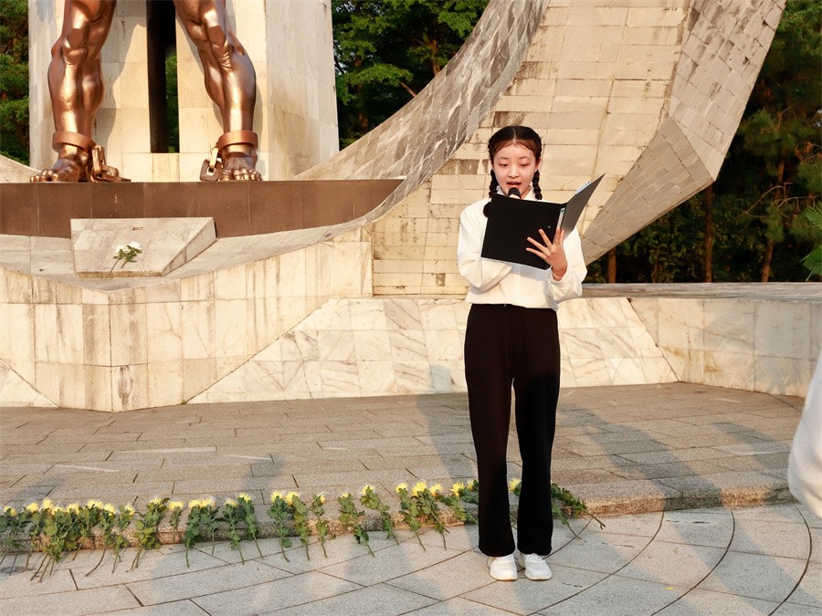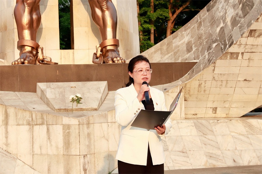 青年团员代表姜红宇在发言中表示,致敬革命烈士,学习先烈事迹,在前进路上汲取奋力拼搏的强大精神动力,今后将更加坚定理想信念,牢记党的宗旨,继承先辈遗志,勇做革命的接班人,肩负起时代的重任,为伟大祖国建设和中华民族腾飞发展贡献青春力量。