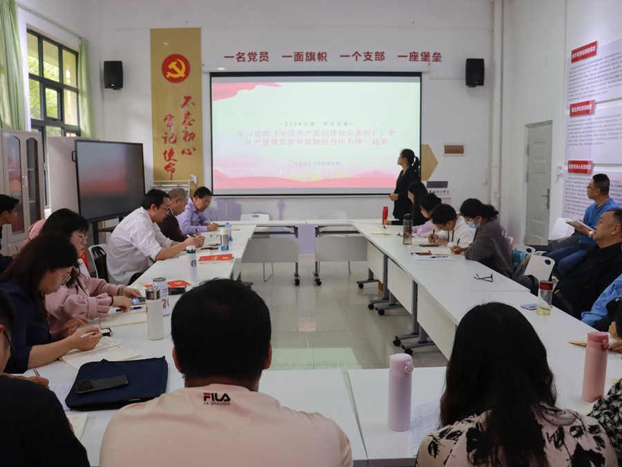 为深入贯彻落实全面从严治党要求,切实增强全体教师的纪律意识,3月22日下午,马克思主义学院党支部书记罗秋梅在行政楼103以《学习贯彻<中国共产党纪律处分条例>:把从严管理监督和鼓励担当作为统一起来》为题开讲第一季度专题党课(以下简称《条例》),学院全体教师参加。