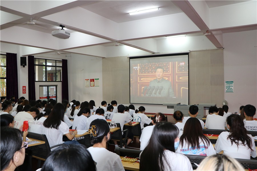 我校师生认真聆听习近平总书记重要讲话,共同回顾中国共产党百年奋斗的光辉历程,共同展望中华民族伟大复兴的光明前景。大家聚精会神地收看、听讲,并不时记录。当习近平总书记向全世界宣告:经过全党全国各族人民持续奋斗,我们实现了第一个百年奋斗目标,在中华大地上全面建成了小康社会,历史性地解决了绝对贫困问题,正在意气风发向着全面建成社会主义现代化强国的第二个百年奋斗目标迈进。这一番振奋人心的话语,大家报以热烈的掌声。