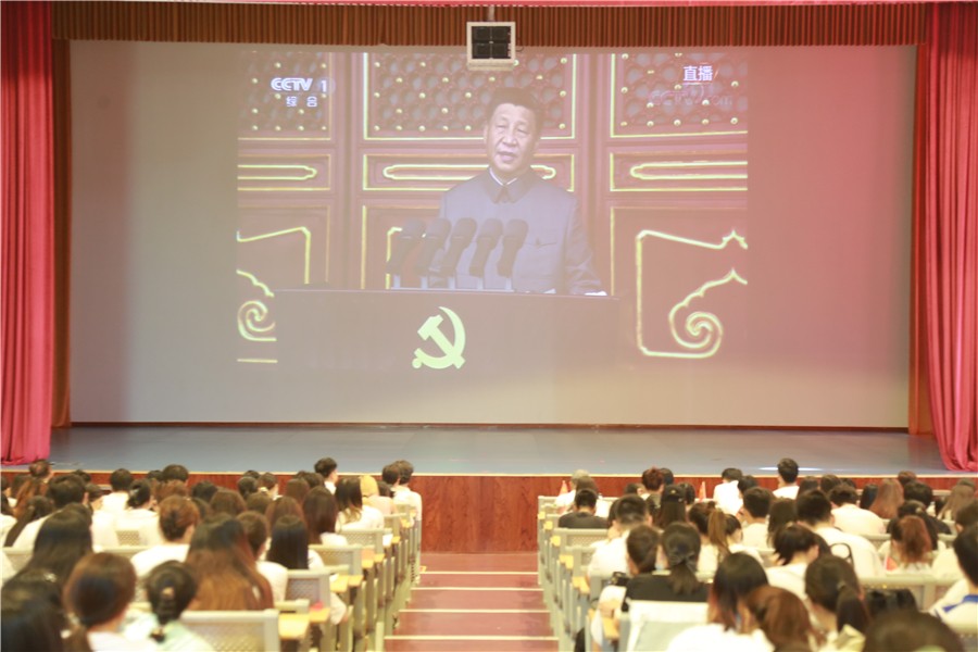 7月1日上午,庆祝中国共产党成立100周年大会在北京天安门广场隆重举行。中共中央总书记、国家主席、中央军委主席习近平同志发表重要讲话。学校党政领导班子成员、全体中层领导干部、党员代表、入党积极分子和学生干部1000余人在学校大礼堂和伦理楼107教室集体收看大会实况。其他师生在分会场通过电视、网络、广播、手机客户端等多种形式收听收看了大会现场直播盛况。