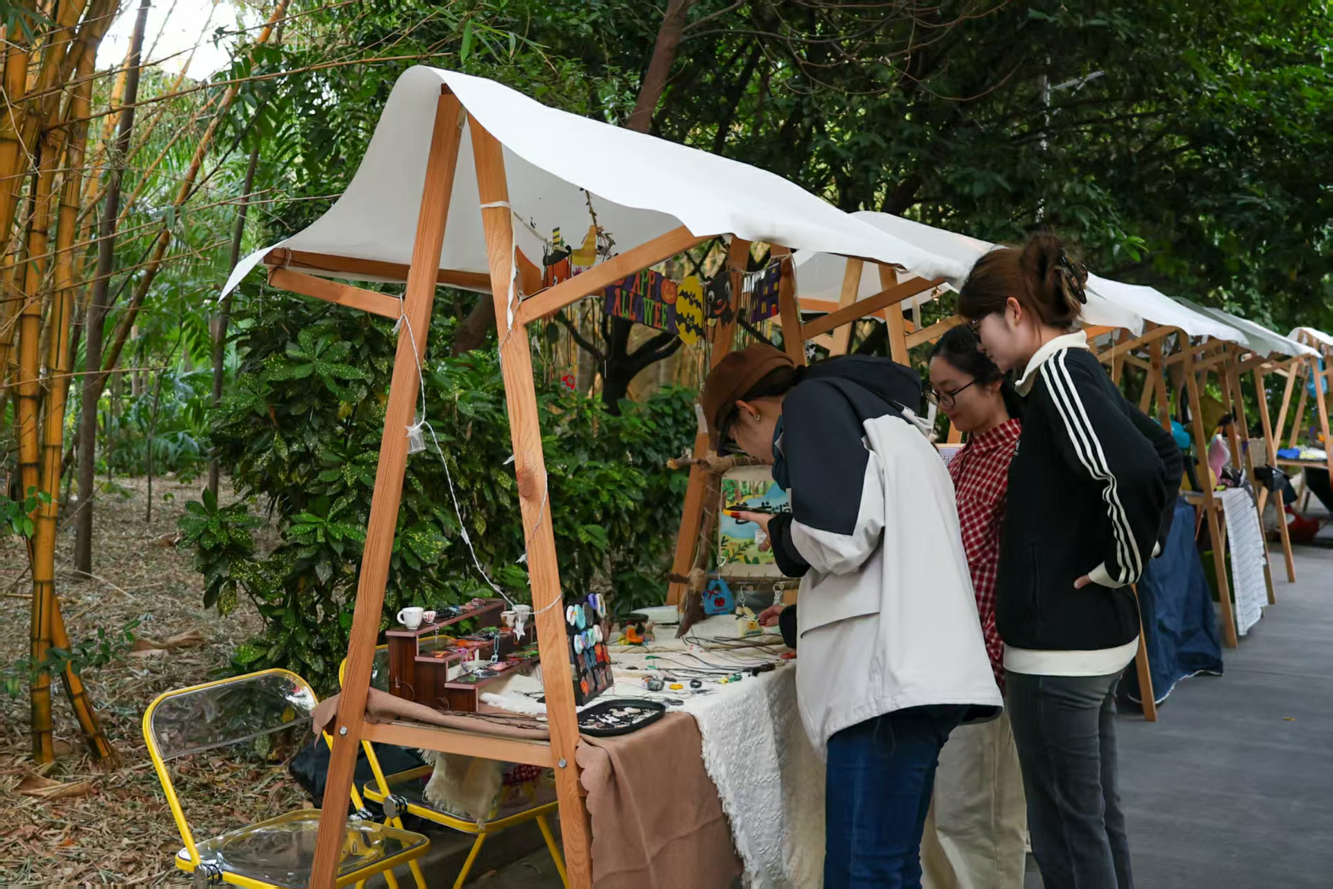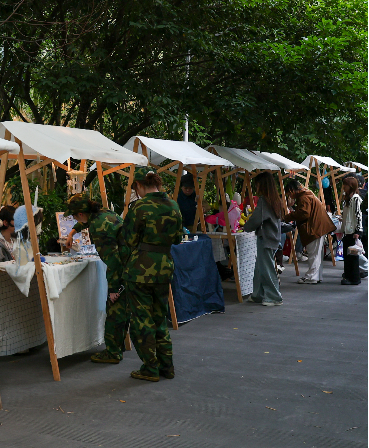 市集现场,来自全校不同专业的学生创客以“摊主”身份参与,集中展示手工艺品、定制服饰、校园主题文创产品、3D打印作品、艺术疗愈相关产品等多个领域的原创作品。这些作品既展现出学生扎实的动手能力与较高的艺术审美水平,更融入了学生对校园文化内涵的挖掘、对生活美学的独特理解。每个摊位均为学生独立运营的微型创业项目,从产品前期设计、原材料采购,到后期营销推广、客户沟通,全流程均由学生自主完成,充分体现了实践育人成效。