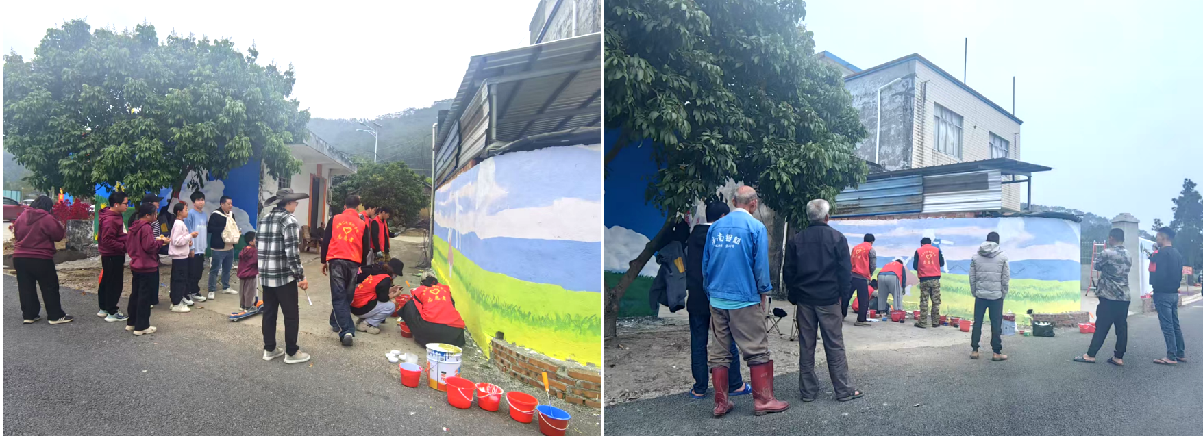 前期进行沟通,与村民代表进行座谈,综合各方建议,形成数据化表格,保障项目的顺利进行。在签订合同后,师生按照合同相关细节进行墙体的绘制,在赵晓盼、田鹏、陈宣辰、刘洋梓老师的带领下,组织学生对墙体进行色彩填涂和图案绘制,师生们踊跃参与,在村民中也取得良好的反响。