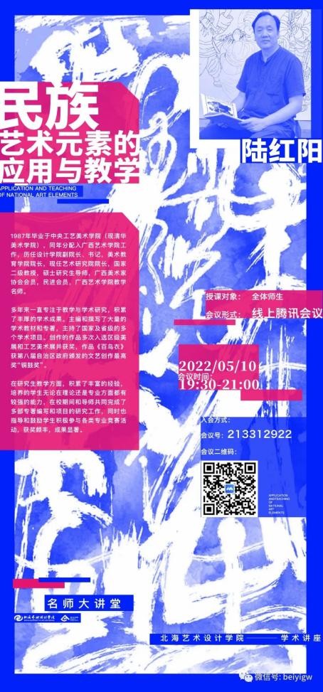 2022年5月10日,广西艺术设计学院教学名师陆红阳教授应邀为我校开展题为“民族艺术元素的应用与教学”的线上讲座。讲座由设计艺术学院李林平院长主持。