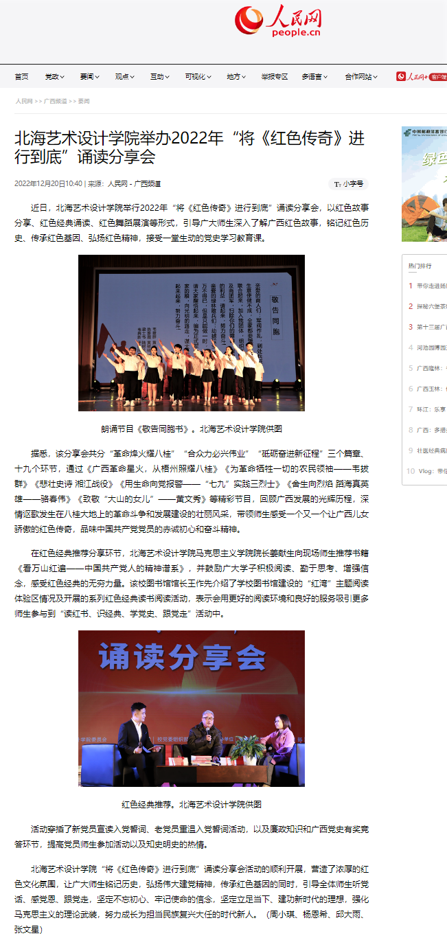 人民网:北海艺术设计学院举办2022年“将《红色传奇》进行到底”诵读分享会