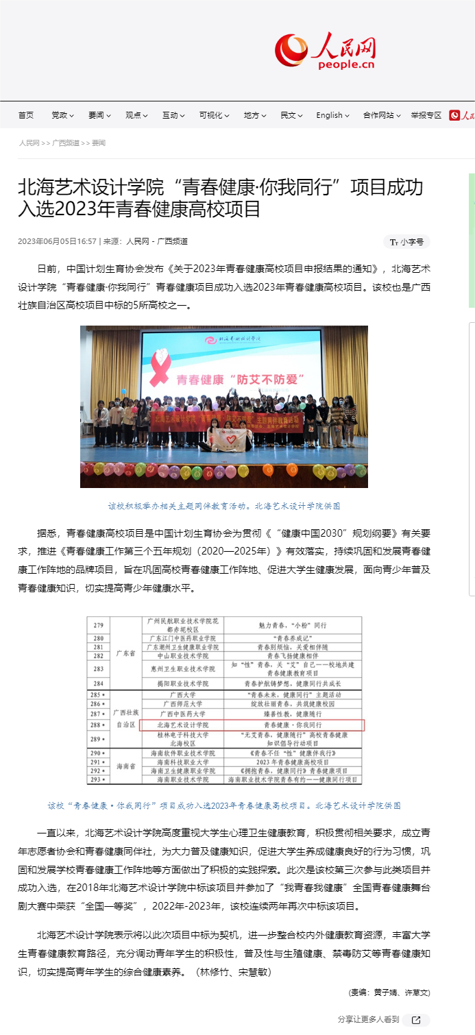 人民网:北海艺术设计学院“青春健康·你我同行”项目成功入选2023年青春健康高校项目