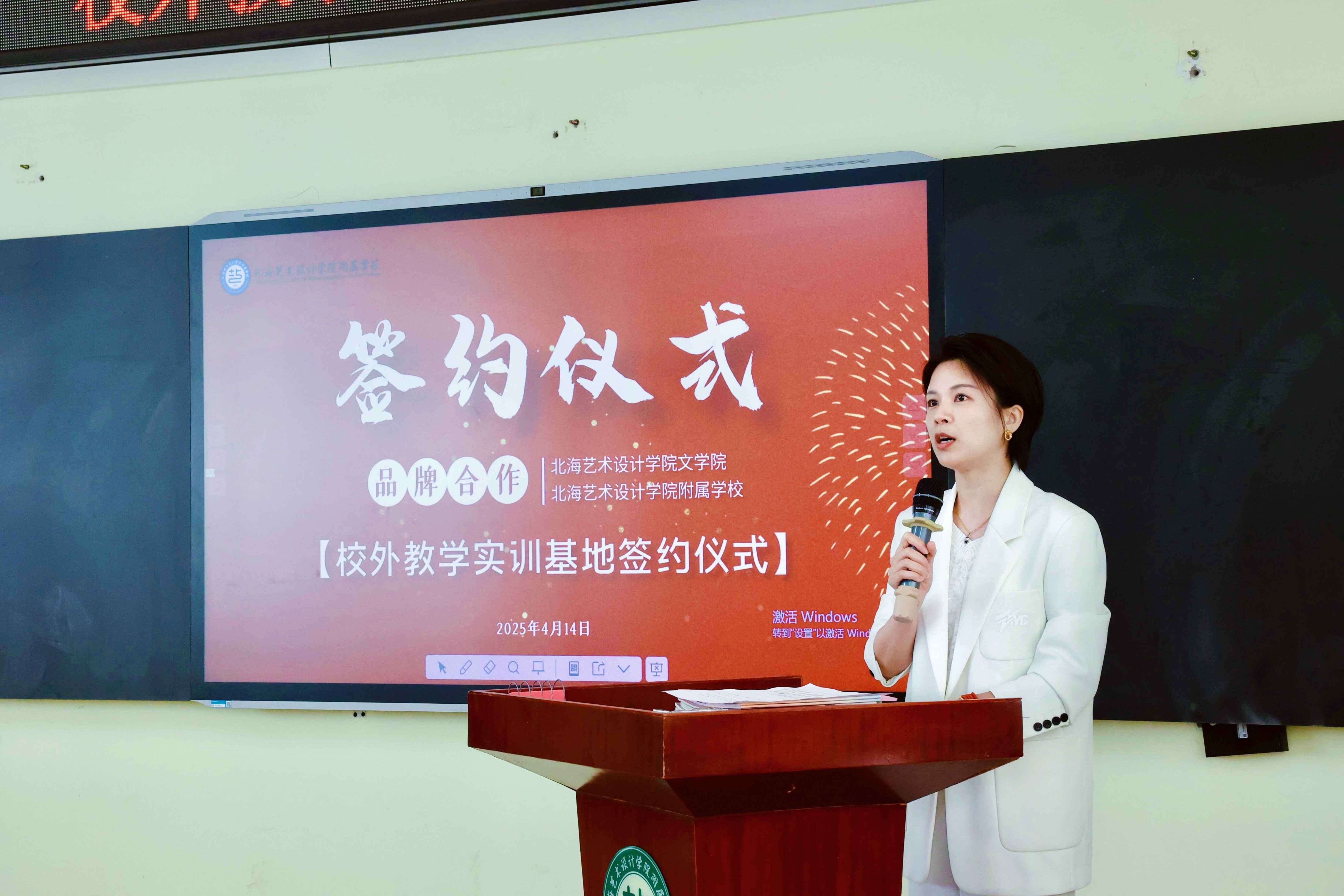 仪式伊始,北海艺术设计学院附属学校校长包玉红发表了热情洋溢的欢迎辞。她详细介绍了学校的发展历程、办学理念、特色课程以及在教学改革方面取得的成果。包校长表示,此次与北海艺术设计学院文学院的合作,将为小学的教育教学注入新的活力,有助于提升小学教师的专业素养和教学水平,推动小学教育的高质量发展。