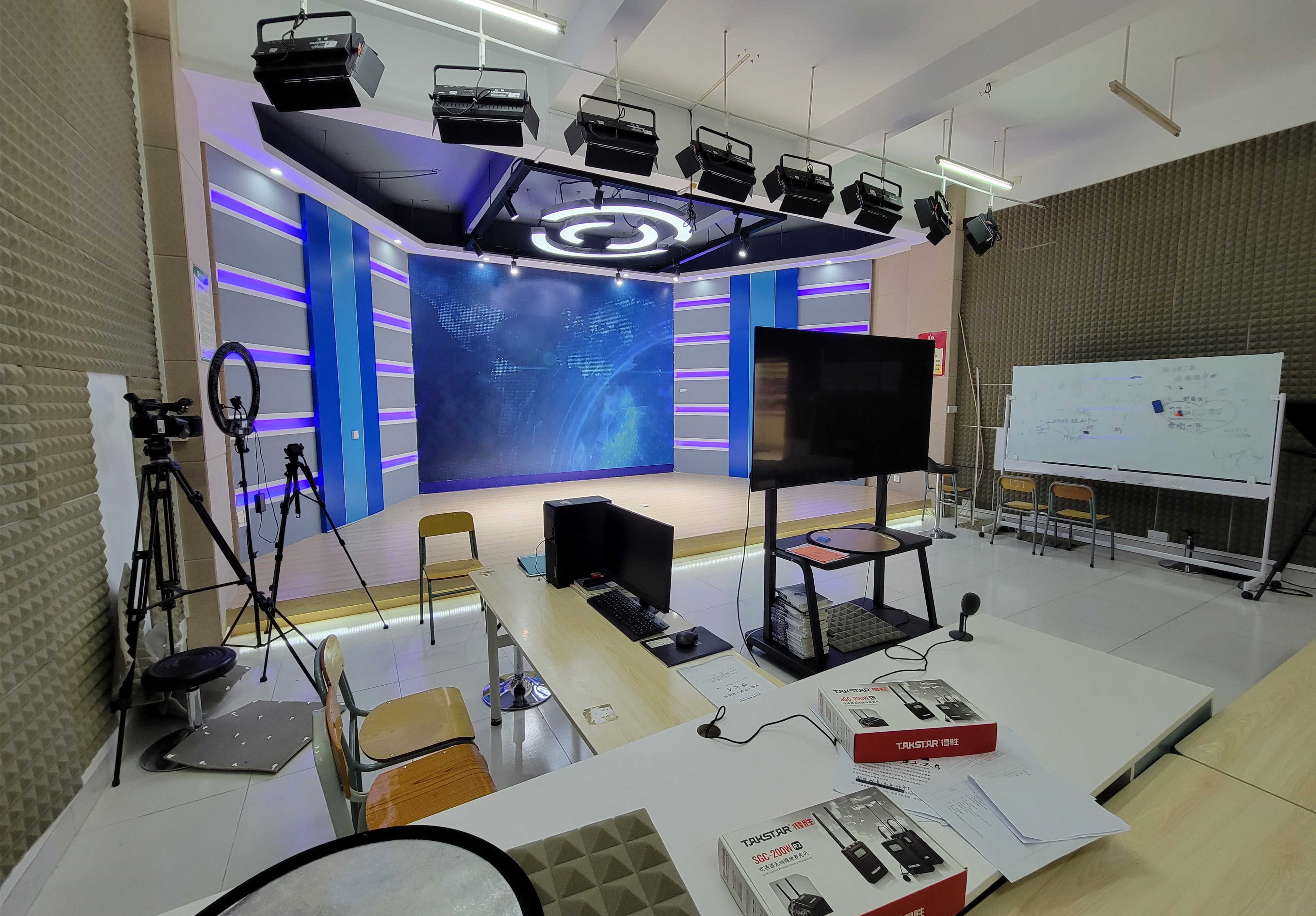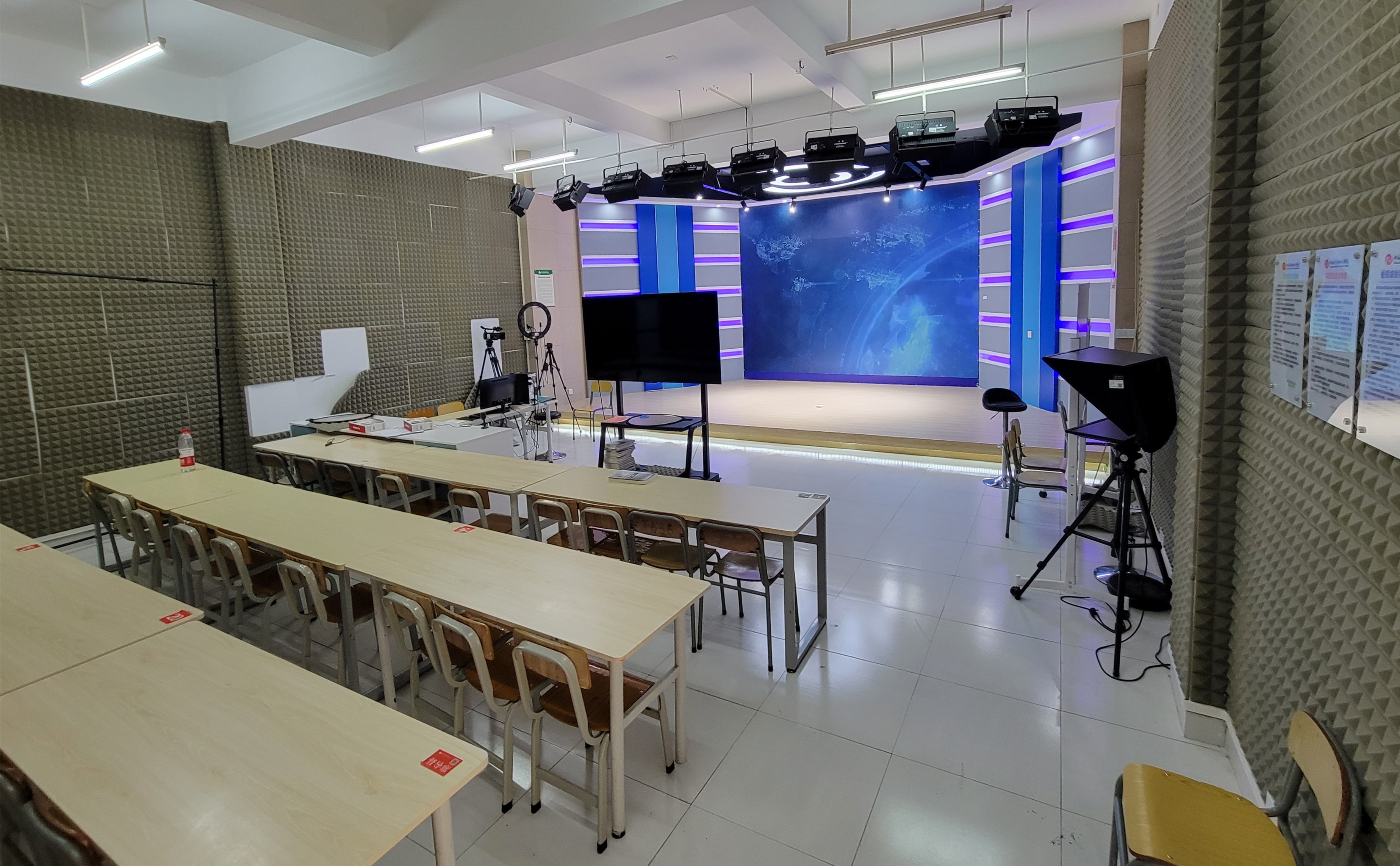 本实验室位于东校区综合楼208室,面积91平方米,分属播音专业实验室,主要承担播音专业的相关实训内容。本实验室配备演播台、演播录制设备等,为学生们提供了专业的设备及优质的环境进行音频及视频作品录制。