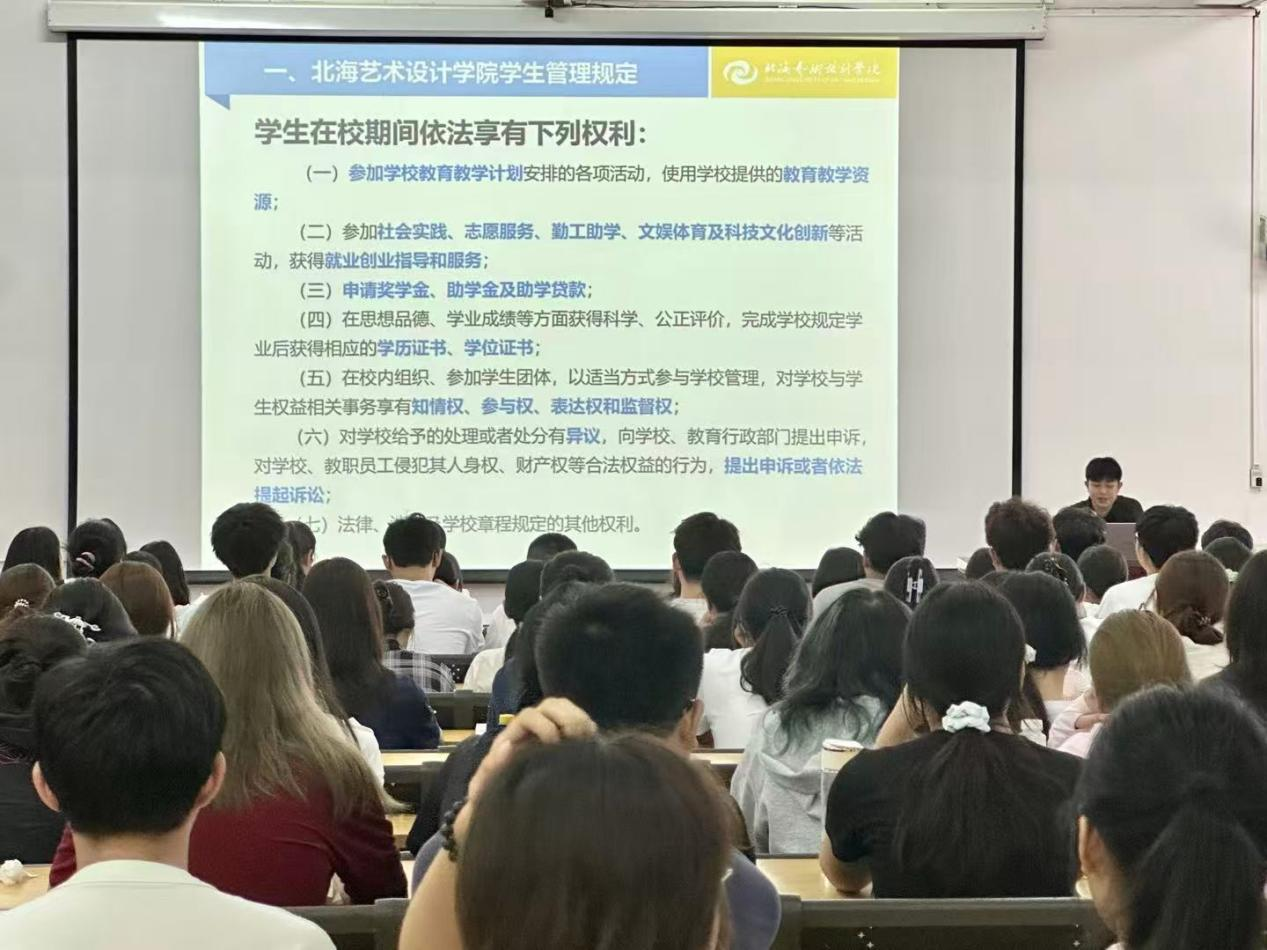随后,韦亮宇老师围绕《学生手册》,就学生管理规定、评奖评优机制、违纪处理办法、缴费管理政策及学生资助体系等内容进行了系统解读,帮助新生明确在校期间的权利与义务。结合校园实际案例,他提醒同学们要自觉遵纪守法、珍惜学习机会、尊敬师长、树立良好品行,远离一切违法违纪行为。