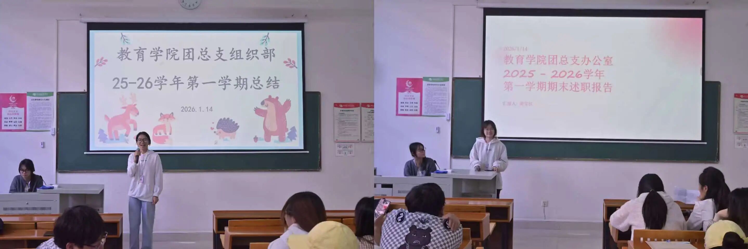 为全面总结本学期团总支各部门工作情况,表彰表现突出的优秀个人,激励全体学生干部在新学期再创佳绩,2026年1月14日,教育学院团总支工作总结暨表彰大会在公德楼102教室顺利举行。团总支书记陈美霖与全体学生干部参加大会。