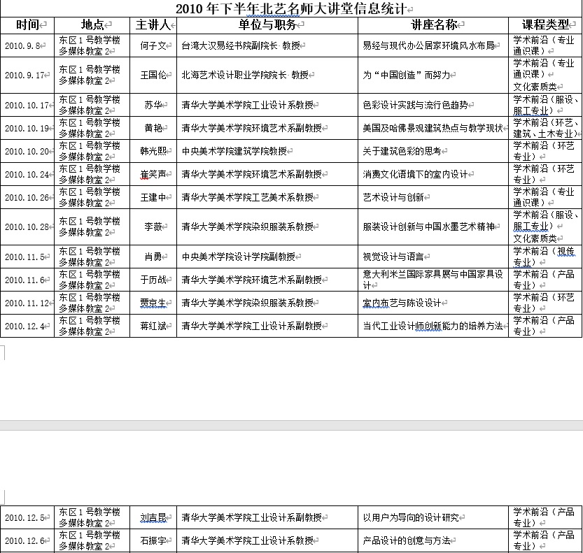 2010年下半年北艺名师大讲堂信息统计