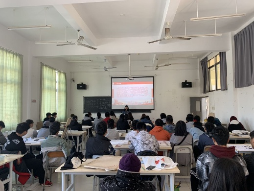 在本次活动中,团支书引出了这次的主题,使活动就此拉开了帷幕。之后继续由主持人向全体团员展示“青春心向党·建功新时代”主题团日活动相关PPT,并进行相关解说,在PPT的首页中就直接明了地向同学们展示了七十周年的大标题,在前言中强调了“青年兴则国家兴,青年强则国家强。正如习近平总书记所强调的,青年一代的理想信念、精神状态、综合素质,是一个国家发展活力的重要体现,也是一个国家核心竞争力的重要因素。