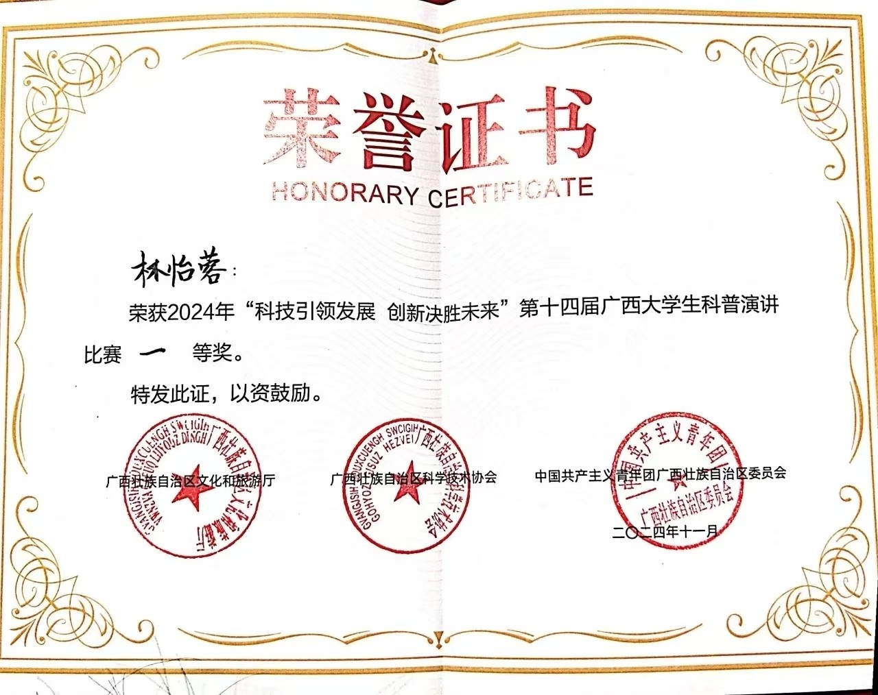 祝贺我校学子在第十四届广西大学生科普演讲比赛决赛中喜获佳绩