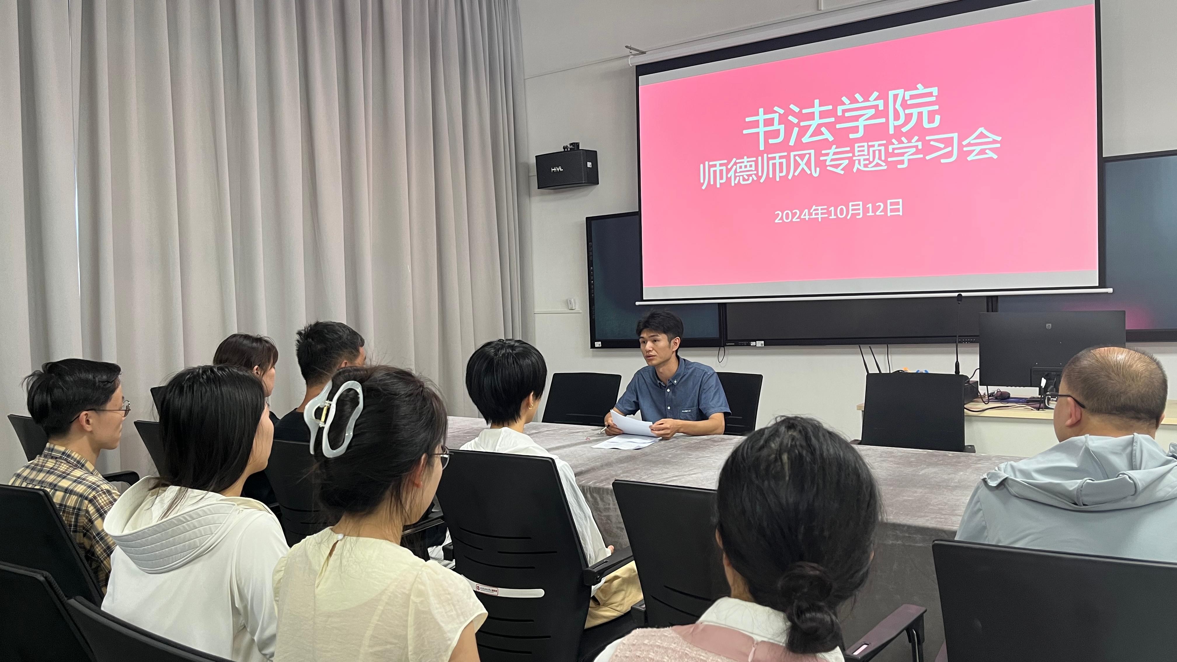 书法学院2024年下半年师德师风专题学习会议2024年10月12日召开,本次会议由书法学院党支部书记喻广林书记主持,喻书记宣布会议开始并简要介绍会议目的及师德师风学习在高校教学中的重要性。