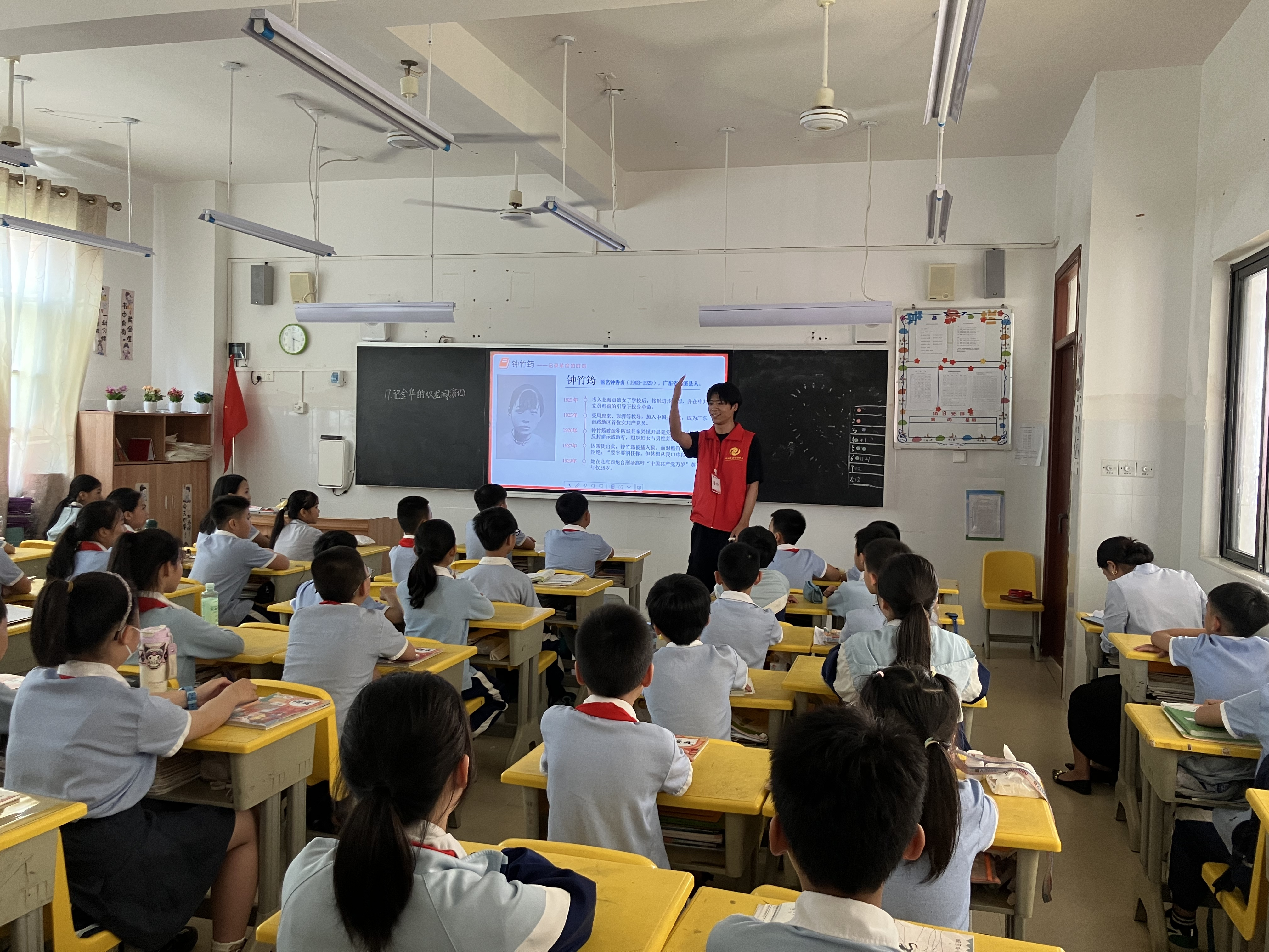 4月18日,见习活动接近尾声,各小组在北海艺术设计学院附属学校五楼会议室展开热烈讨论,围绕一周来的见习内容及心得体会进行了深刻的反思和总结。随后,各小组围绕“讲好北海故事、传承红色基因主题,策划并亲身实践一次走上讲台,带领小学生开班会教学活动。各小组同学充分发挥创意,巧妙设计了形式多样的互动教学环节,通过寓教于乐的方式将红色文化元素融入课堂实践,充分彰显了们卓越的教学创新能力和教育使命意识。