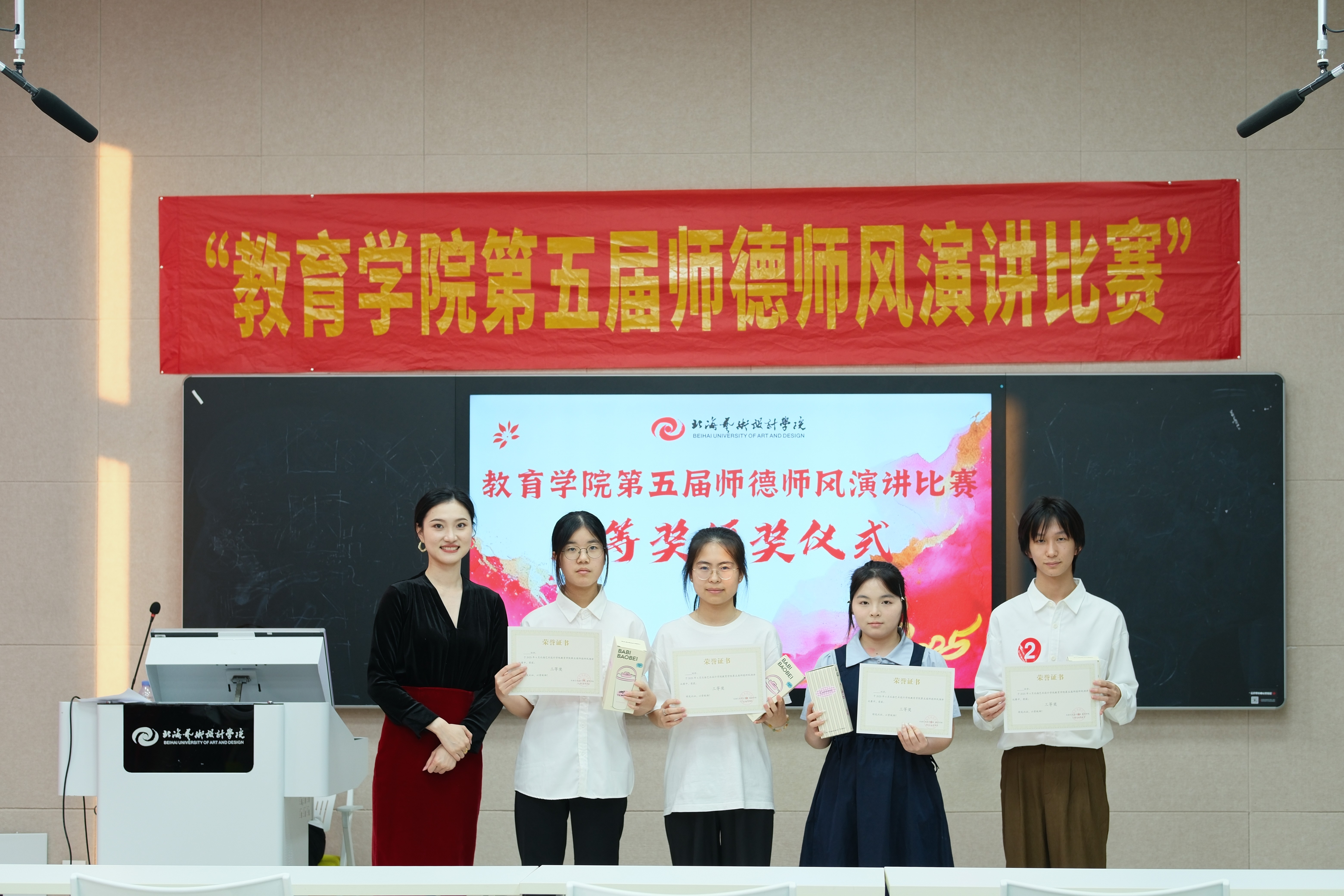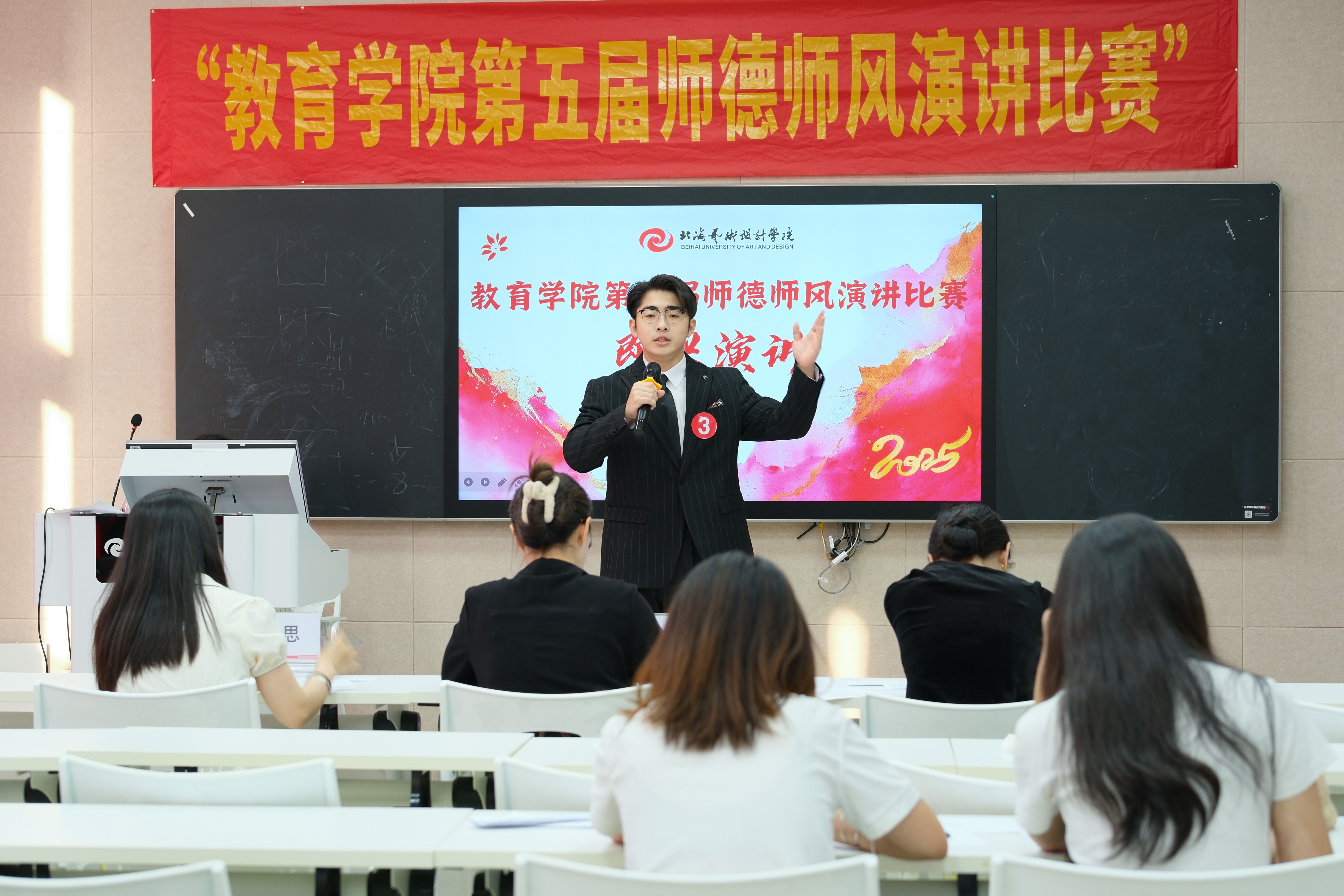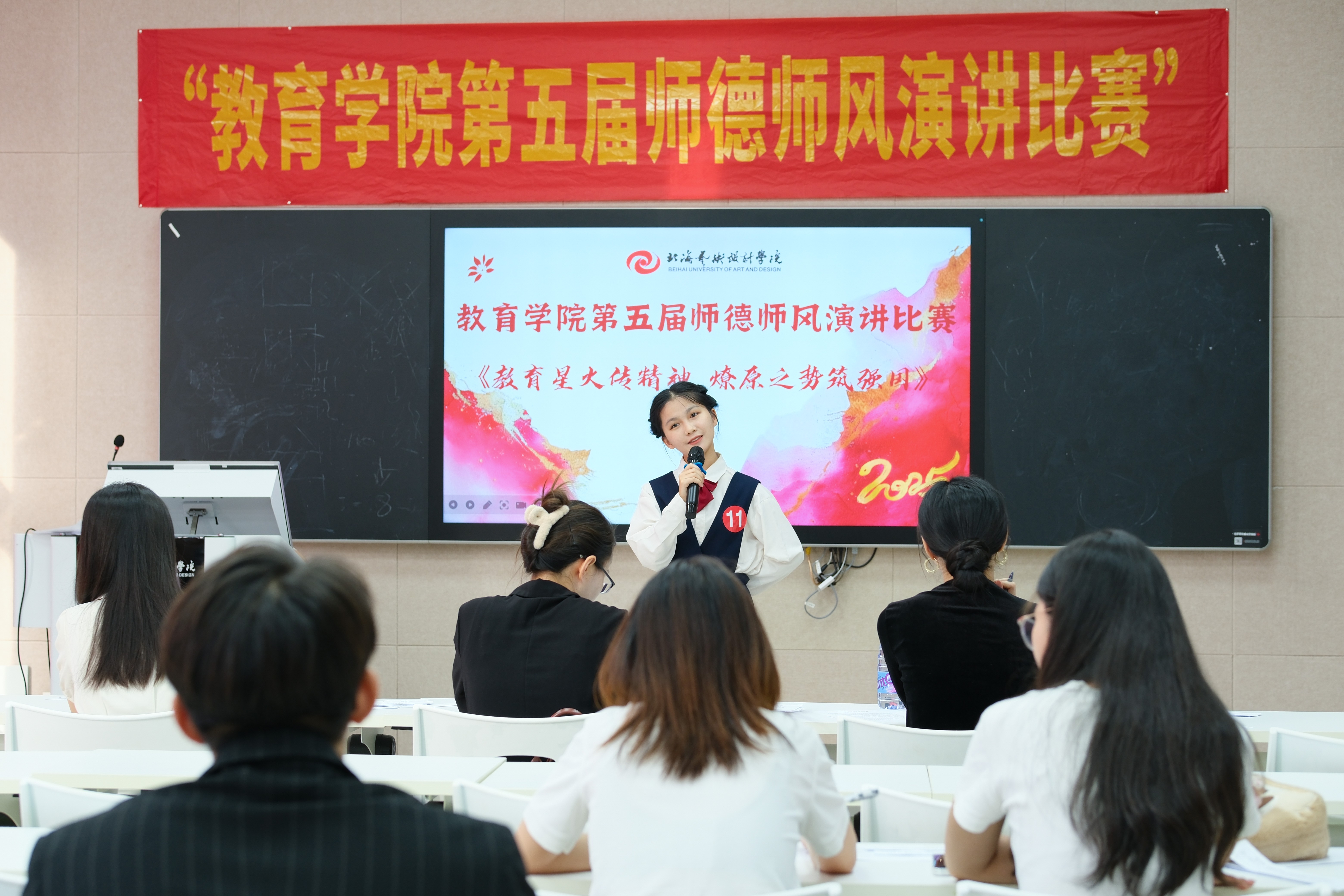 此次比赛不仅是一次师德风采的集中展示,更是一场精神力量的传递与共鸣。选手们紧扣 “弘扬教育家精神,加快建设教育强国”主题,以鲜活的教育案例与炽热的育人情怀,深刻诠释了教育工作者的责任与担当。现场既有扎根三尺讲台的坚守故事,也有创新育人模式的实践感悟,生动展现了教育学院师生以教育家精神为指引、深耕教育事业的坚定信念。同时也激励着教育学院全院师生将教育家精神融入日常教学与学习中,以实际行动为教育强国建设添砖加瓦,同时为学院师德师风建设注入了更富活力的时代动能。(缪仁文、董秋伶、刘珊彤/摄)