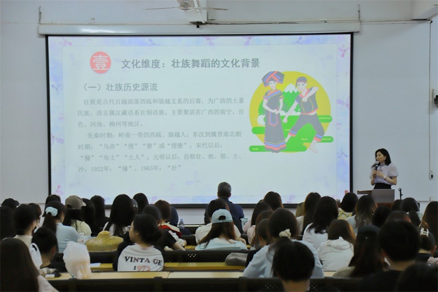 521日下午,广西大学艺术学院副院长、舞蹈系主任,硕士研究生导师付宜玲教授莅临我校,在西校区伦理楼107教室为学校师生带来了一场题为《壮族舞蹈的多维阐释》的精彩讲座。讲座以壮族舞蹈为核心,通过多维度的学术视角,探讨其独特的文化符号、历史演变、艺术表现及当代传承。为现场师生带来一场精彩的文化学术盛宴。