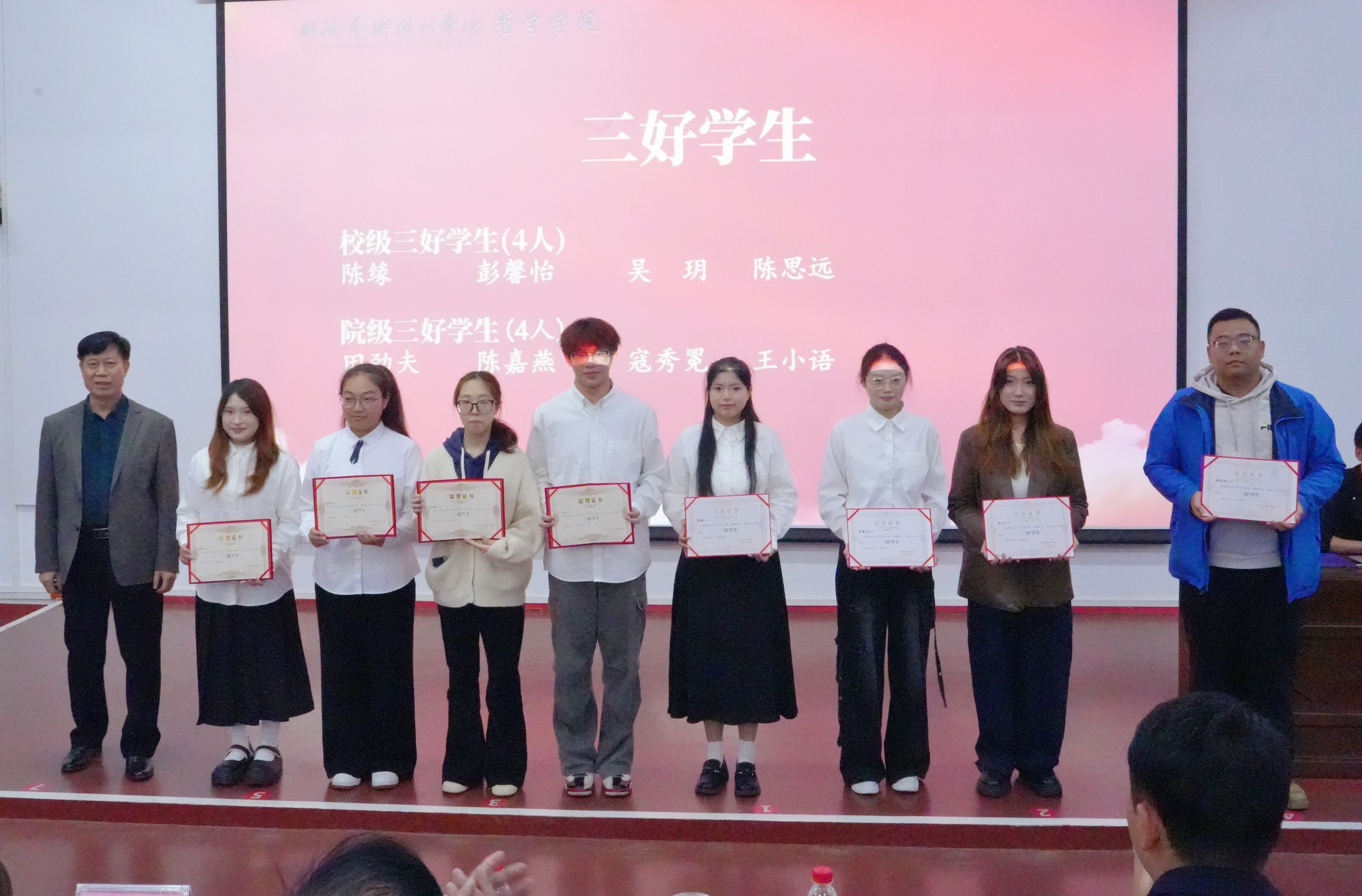 在颁奖环节,大会依次对优秀学生和先进集体进行了表彰。获奖者包括军训优秀标兵2人,优秀迎新志愿者3人,校级优秀共青团员2人,优秀共青团干部2人,校级优秀学生干部9人,校级和院级三好学生8人,优秀学生奖学金获得者6人,筑梦奖学金获得者李晶晶,自治区人民政府奖学金获得者陈嘉燕,国家励志奖学金获得者郝悦、田劲夫、吴玥,国家奖学金获得者哲学2301班彭馨怡。还包括优秀内务寝室、校级文明宿舍、优秀班集体、五四红旗团支部等8个先进集体。学院领导和教师代表依次为获奖学生颁奖。