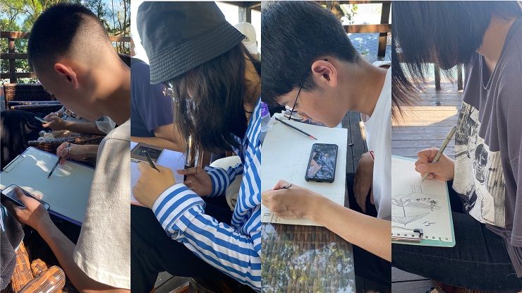同一时间段我院艺术教育专业的同学在唐道明老师的带领和指导下于鳄鱼山景区开启了他们的“写生之旅”。久居学院教室的同学们初次“解放双眼”,他们与自然天地为伴、与海洋风光为伍,用心感受大自然的风情、聆听大海的声音。风趣幽默的唐老师,用自己独特的方式向大家传递他对于美术的见解,在同学们作画之时给予细心点评,让同学们构图线条等方面有了更深刻的理解“纸上得来终觉浅,绝知此事要躬行”,艺术教育专业的同学们在实践中与自然对话,将自然物语书于纸墨。岩石间忙碌的身影与海浪,阳光相融,构成了最美丽的人文风景画。