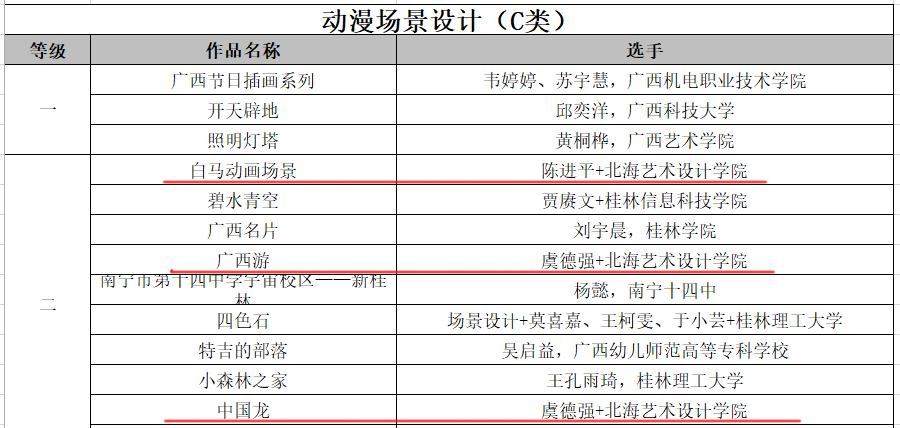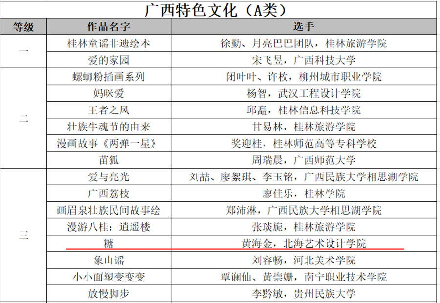 近日,由广西壮族自治区文化和旅游厅、自治区教育厅、自治区科学技术厅、自治区农业农村厅、自治区商务厅、自治区国资委主办,广西广文创意数字科技有限公司承办的“漫绘广西,秀展八桂” 2022广西金桂国漫大赛公示了获奖名单。我校动画与传媒学院共获奖11项,其中场景类二等奖3项、三等奖1项、优秀奖1项;动漫角色设计类二等奖1项、三等奖1项;广西特色文化类三等奖1项、优秀奖3项;孙永辉、 虞德强、李宗毅、吴锡红等老师荣获优秀指导教师奖;动画与传媒学院获优秀组织奖。