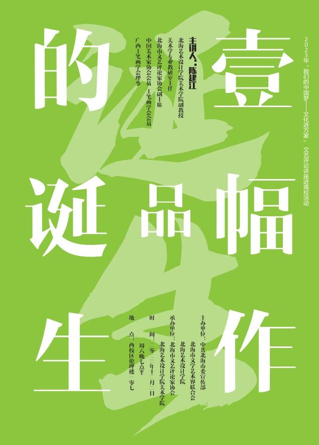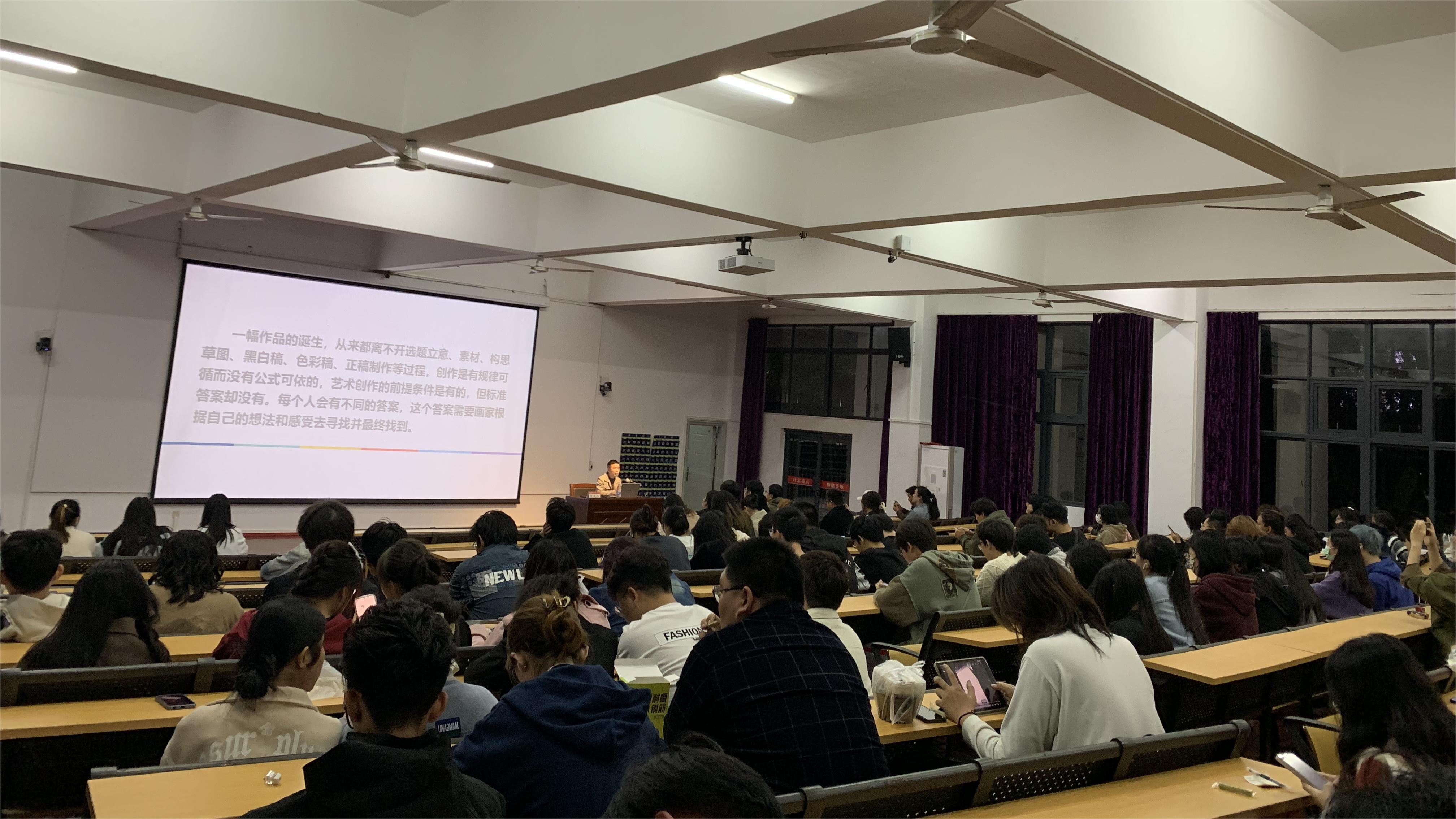 2023122日晚,北海艺术设计学院陈建江副教授为我校绘画、美术学专业以及其他造型艺术相关专业同学开展题为《一幅作品的诞生》的专题讲座,讲座由美术学院龚为院长主持。本次讲座是中共北海市委宣传部、北海市文学艺术界联合会举办的2023年“我们的中国梦——文化进万家”文艺活动中文艺评论讲座进高校活动的重要组成部分。
