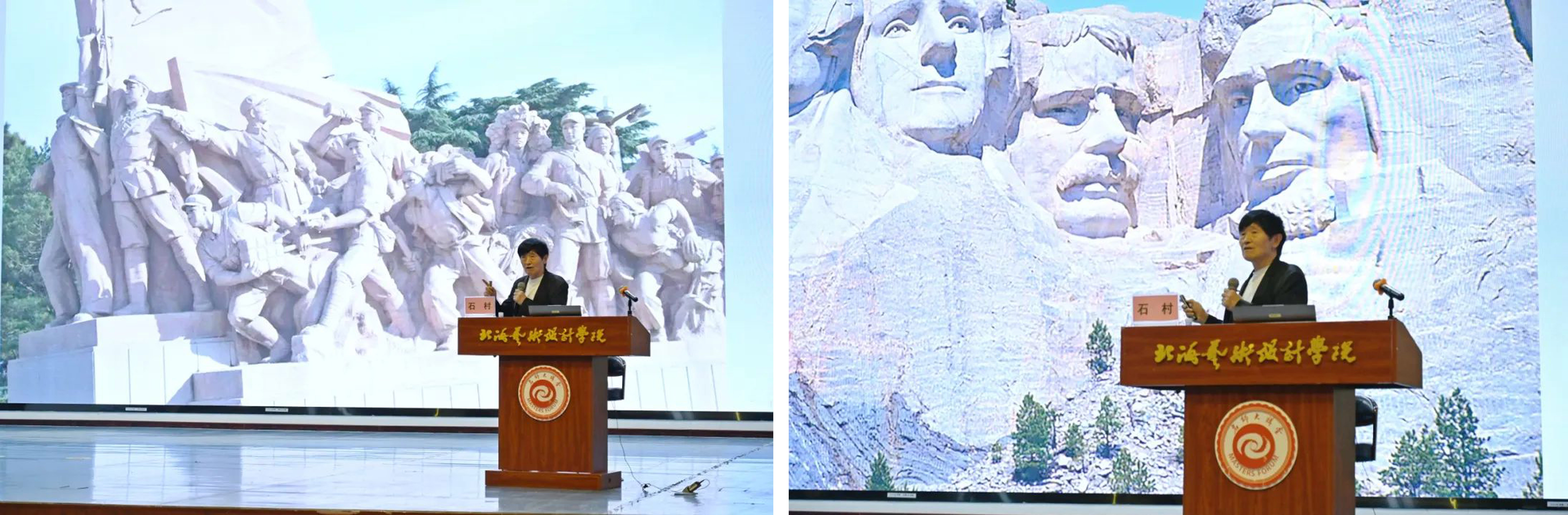 讲座伊始,石村教授通过提出问题“什么是主题性创作?”引发现场师生思考和讨论,并引入讲座授课内容。石村教授通过古今中外世界各国的艺术作品案例解析,指明了艺术创作应强调主题的社会功能,反映国家意志和主导意识,塑造国家形象,展现历史与民族精神。主题性美术创作的主题表达要突出时代主旋律,体现社会主义核心价值观,传递正能量;要追求真、善、美的艺术永恒价值,以美化人;要追求思想内容与完美艺术形式的统一。