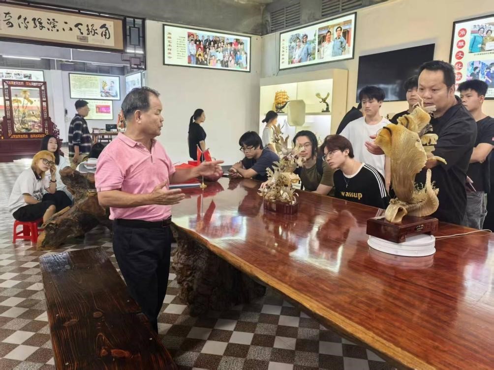 本次考查的内容着重在于传统工艺与专业融合,考察聚焦合浦角雕、南流江玉雕等广西特色工艺,结合雕塑专业特性,引导学生从材料运用、造型技法等角度分析传统工艺的现代转化可能性。活动中师生与非遗传承人白耀华大师交流、探讨传统雕刻技艺在当代艺术创作中的应用路径,以及角雕未来发展的趋势。