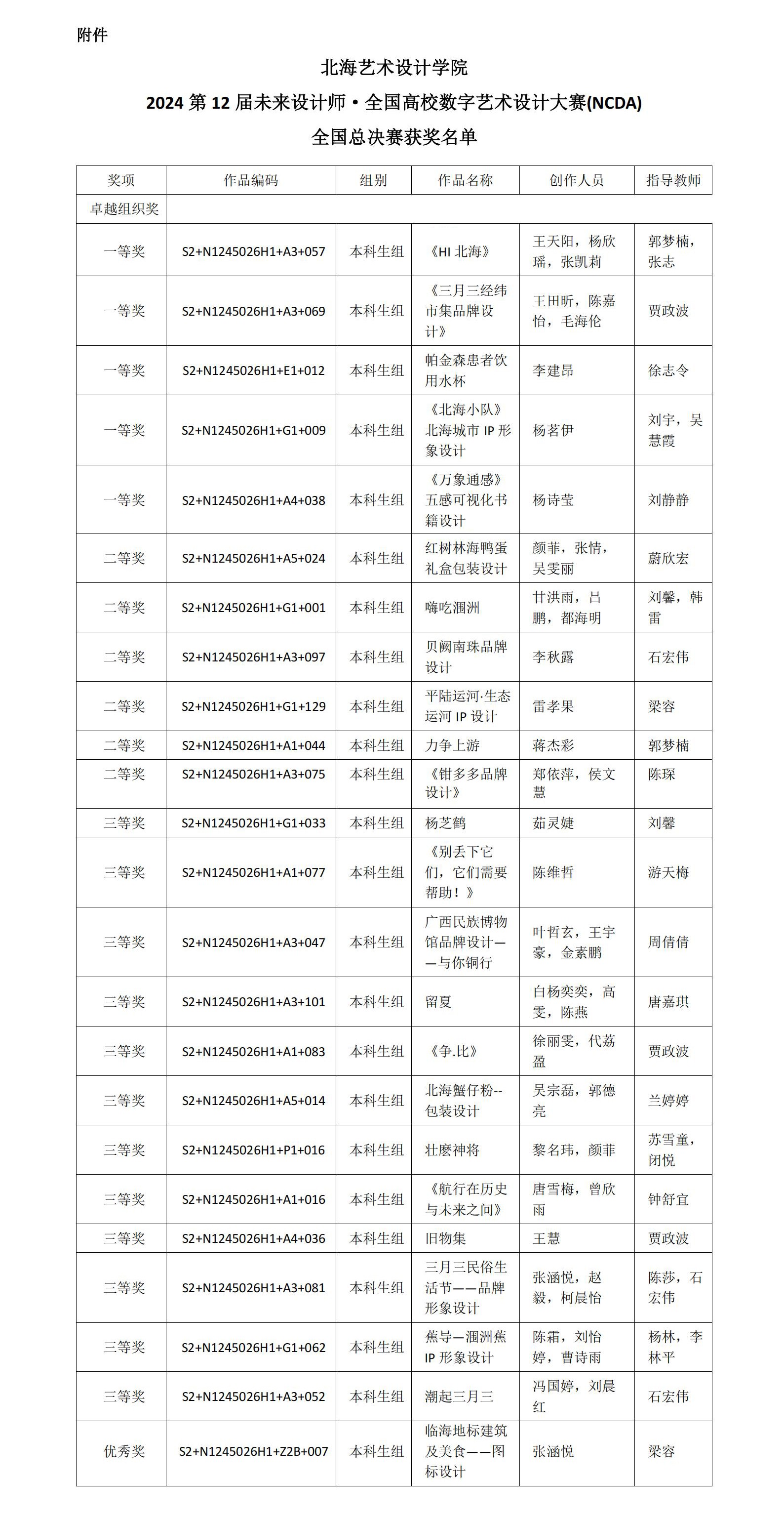 同时,在2024未来设计师·全国艺术设计教师教学创新大赛(NDTC)中,设计艺术学院教师吴慧霞团队课程案例《北海文化旅游品牌形象设计》荣获“案例”赛道全国一等奖;白建强团队课程《文创产品设计》荣获“课程”赛道广西赛区二等奖;梁容老师作品《广西八桂城市市花主题邮票设计》和蓝冬洁老师作品《乡村故事》分别荣获“作品”赛道广西赛区二等奖。