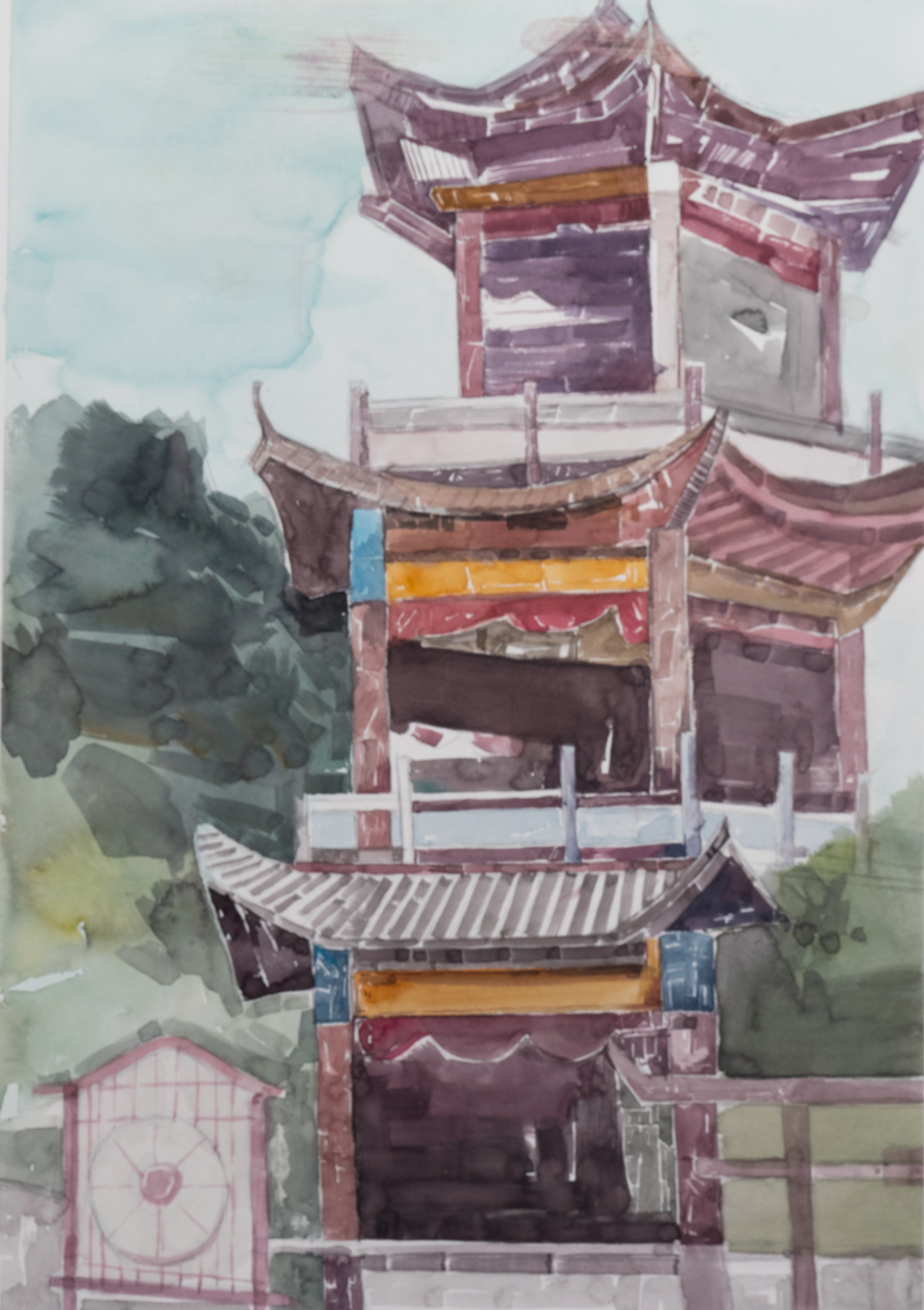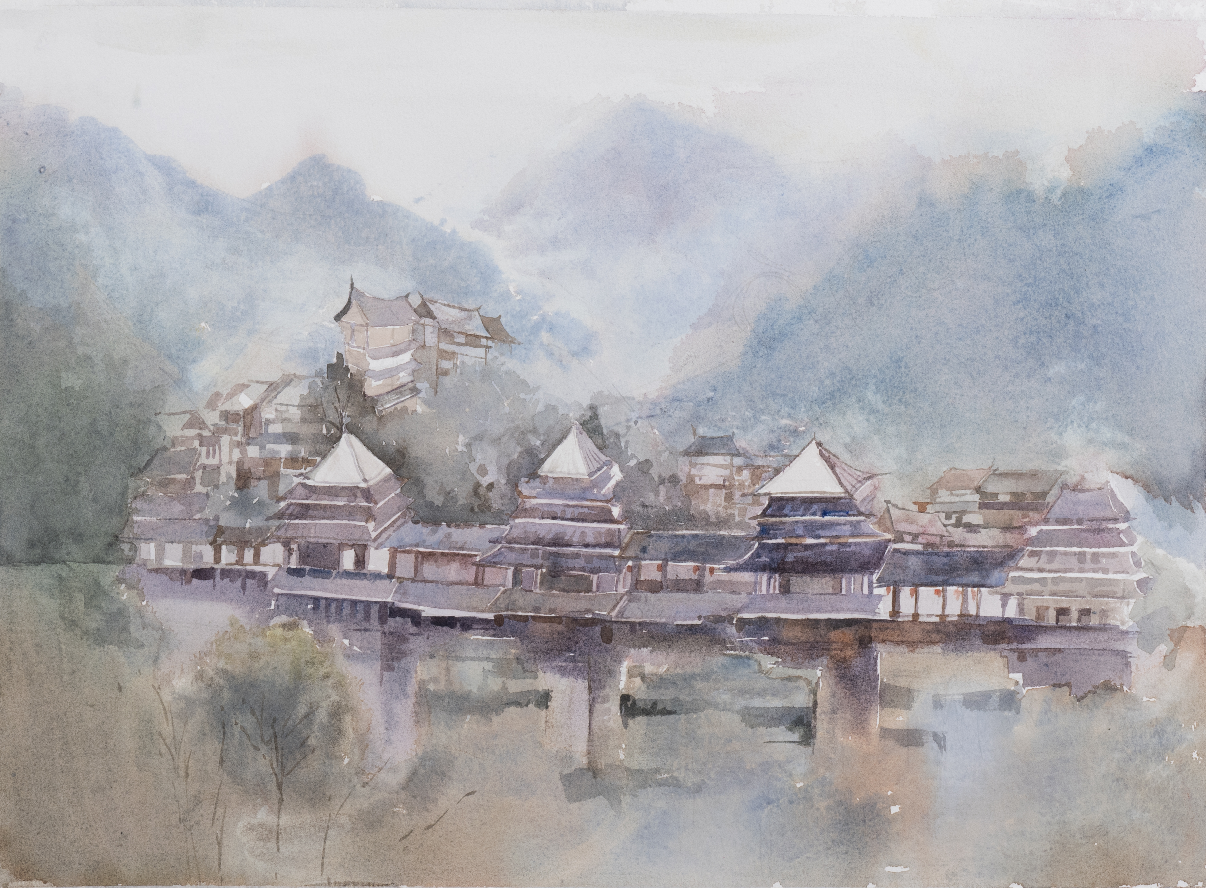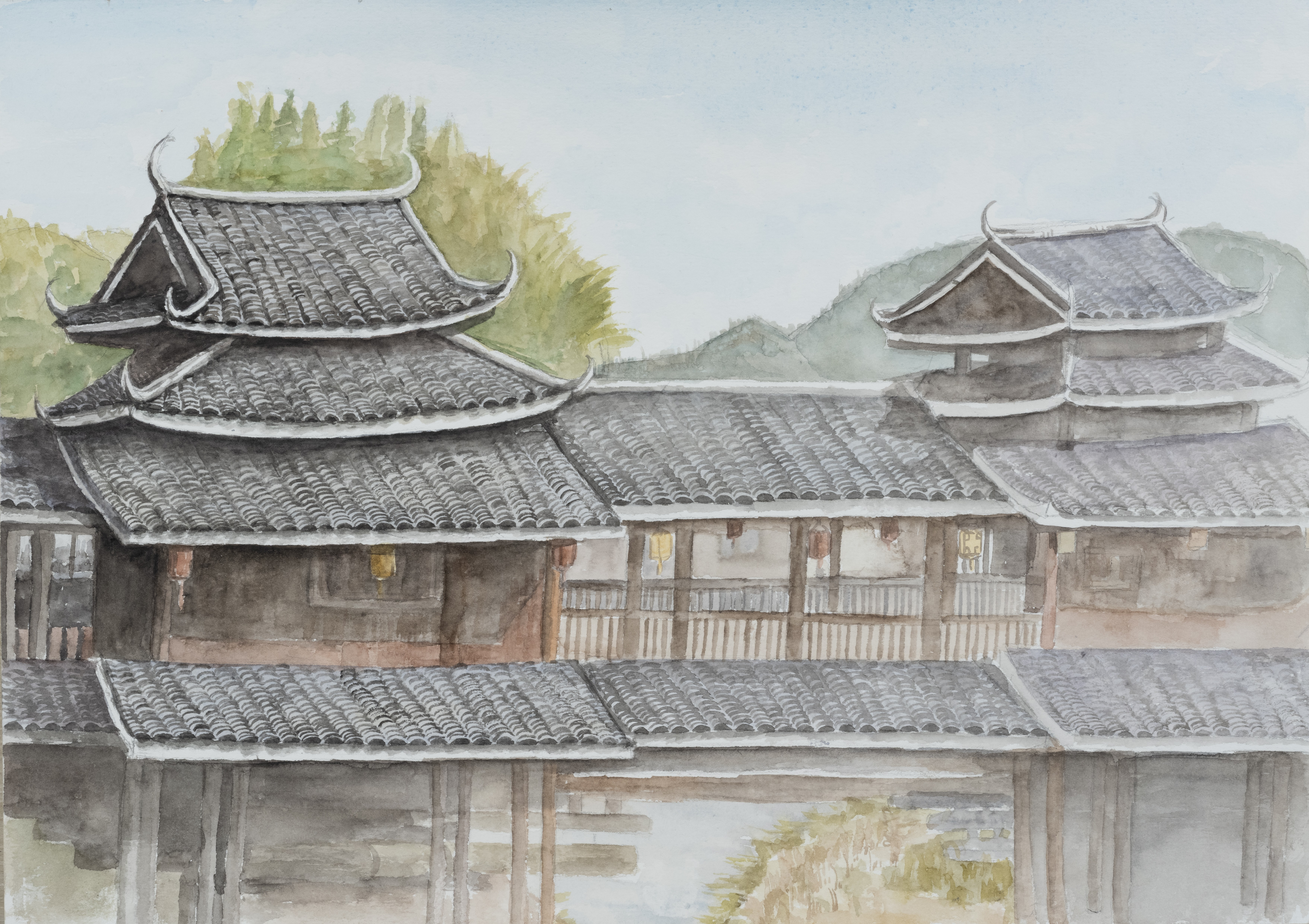 学生作品:美术学2407、08班,包敏玮水色侗居》,38cmX54cm