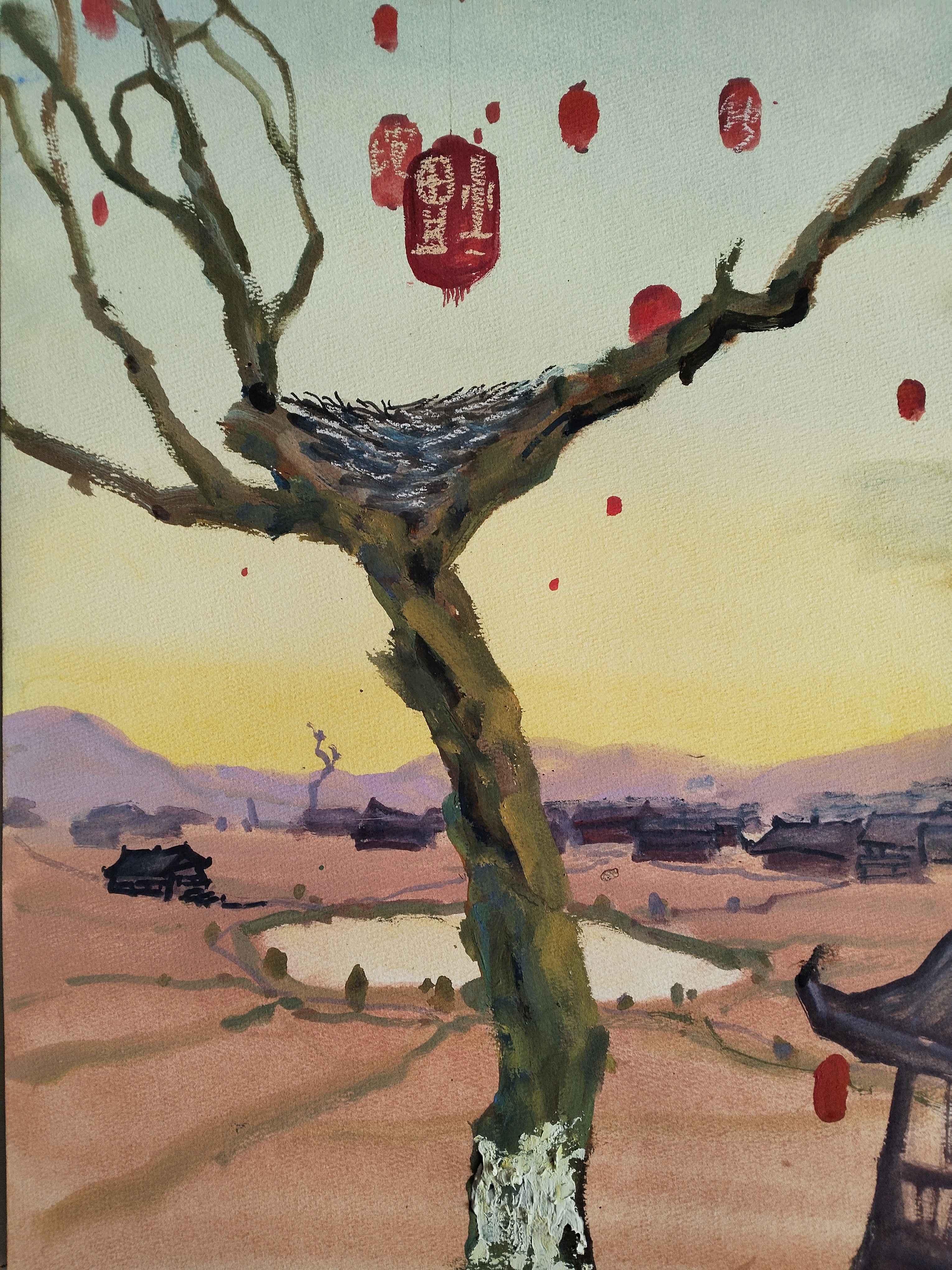 学生作品:绘画2301班,郑雨欣《小村》,45cmX65cm