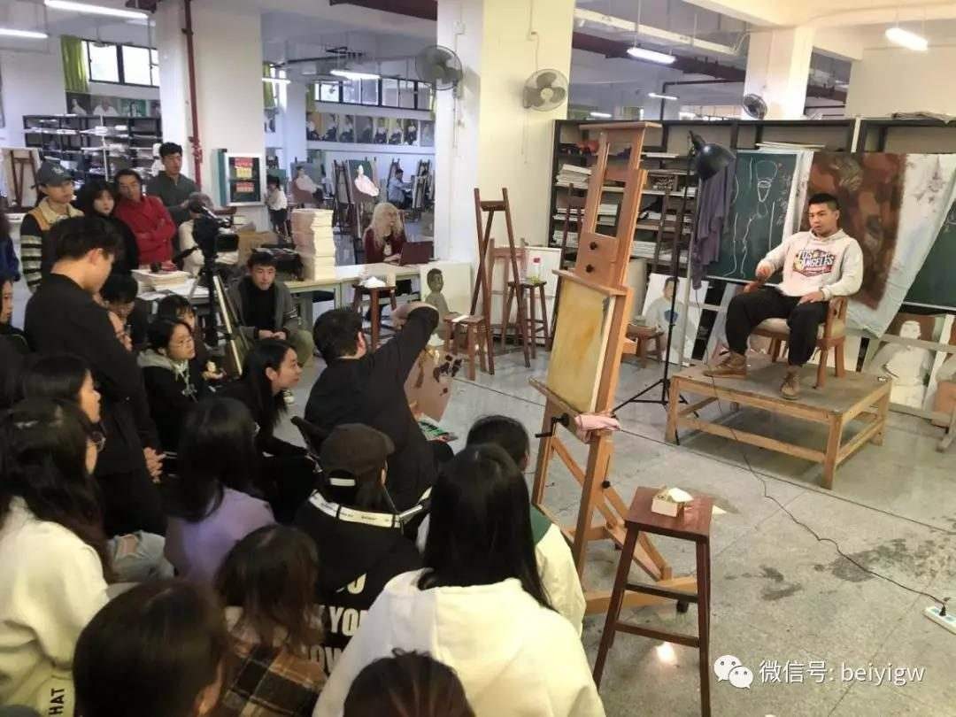 12月13日上午,迪伦主任亲临18级绘画教室,对绘画班色彩人物课程学生作品进行点评指导。为期三天的交流访问活动圆满结束。 (陈建江 摄)