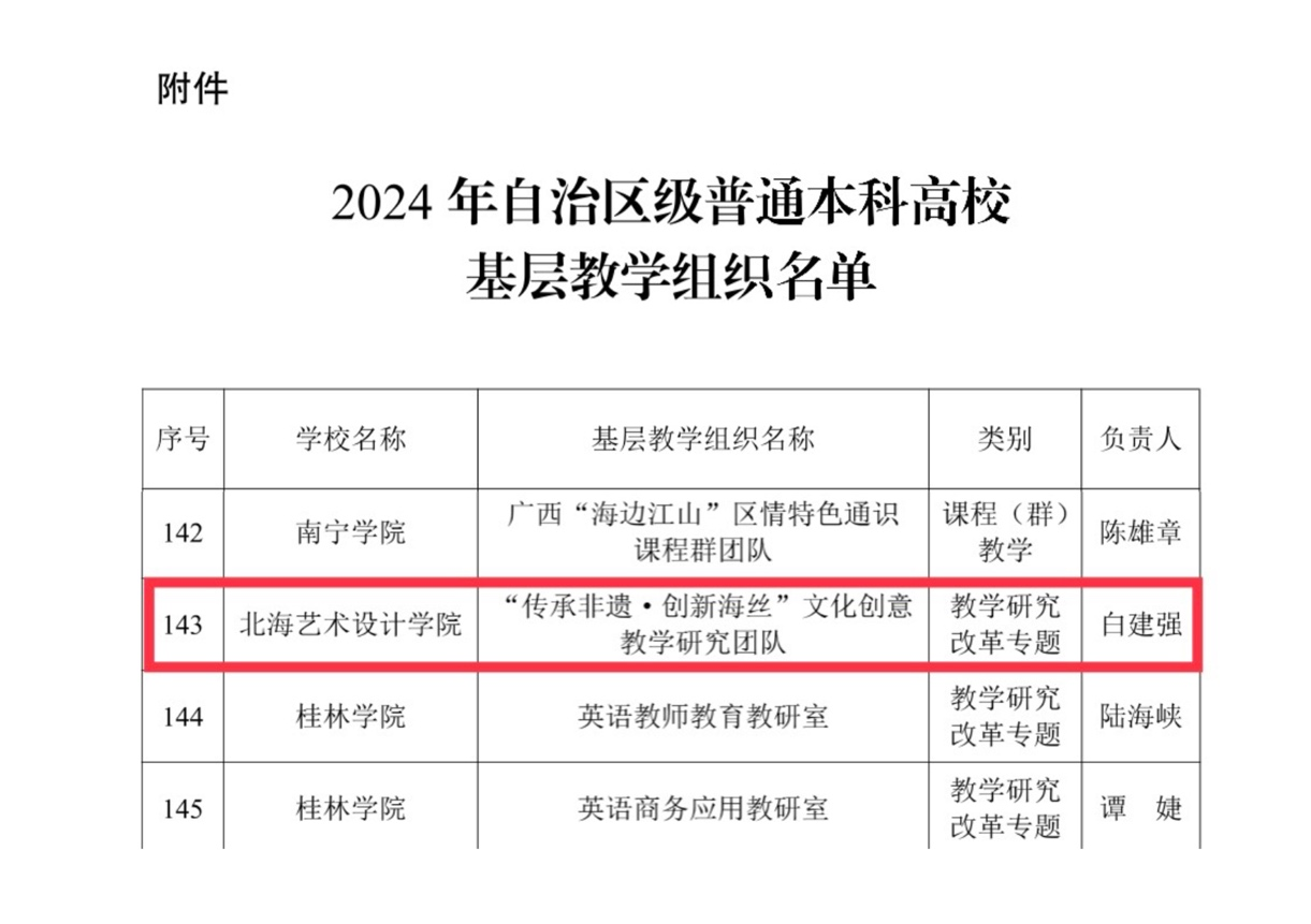 北海艺术设计学院《“传承非遗·创新海丝”文化创意教学研究团队》入选2024年自治区级普通本科高校基层教学组织