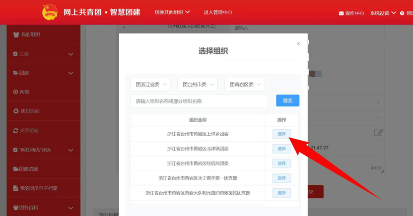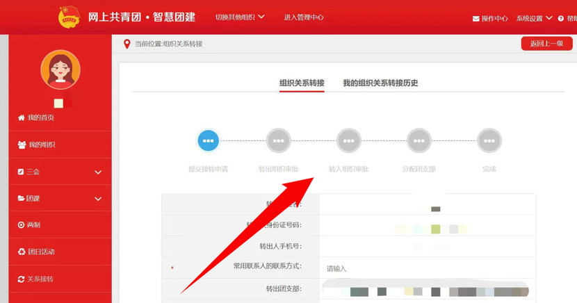 4.选择转出团支部、转出人姓名、转入组织是否属于北京/广东/福建、转出原因和转入组织等。提交申请,在转入组织的管理员审批同意后,转接完成。