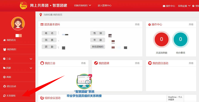 3.团员登录系统进入个人中心,点击中间“组织关系转接”菜单。