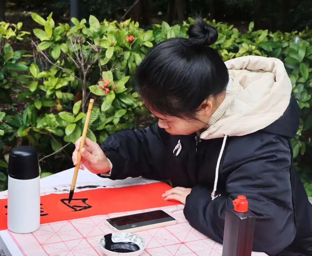 志愿者一起挥毫泼墨,用或丰实厚重,或飘逸潇洒的笔触,满怀热情地写下一幅幅饱含美好祝福的春联。正所谓无联不成春,有联春更浓,他们挥毫笔墨、走笔游龙,笔尖点缀着人间烟火气息,赢得在场学生阵阵赞誉。“爆竹四起接五福,梅花一枝报三春”、“福如旭日腾云起,财似春潮乘风来”、“国泰民安逢盛世,风调雨顺颂华年”一幅幅春联里都承载着新春最诚挚的祝福。