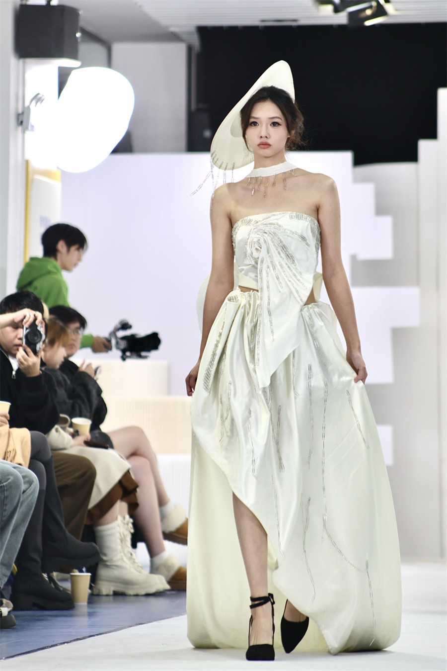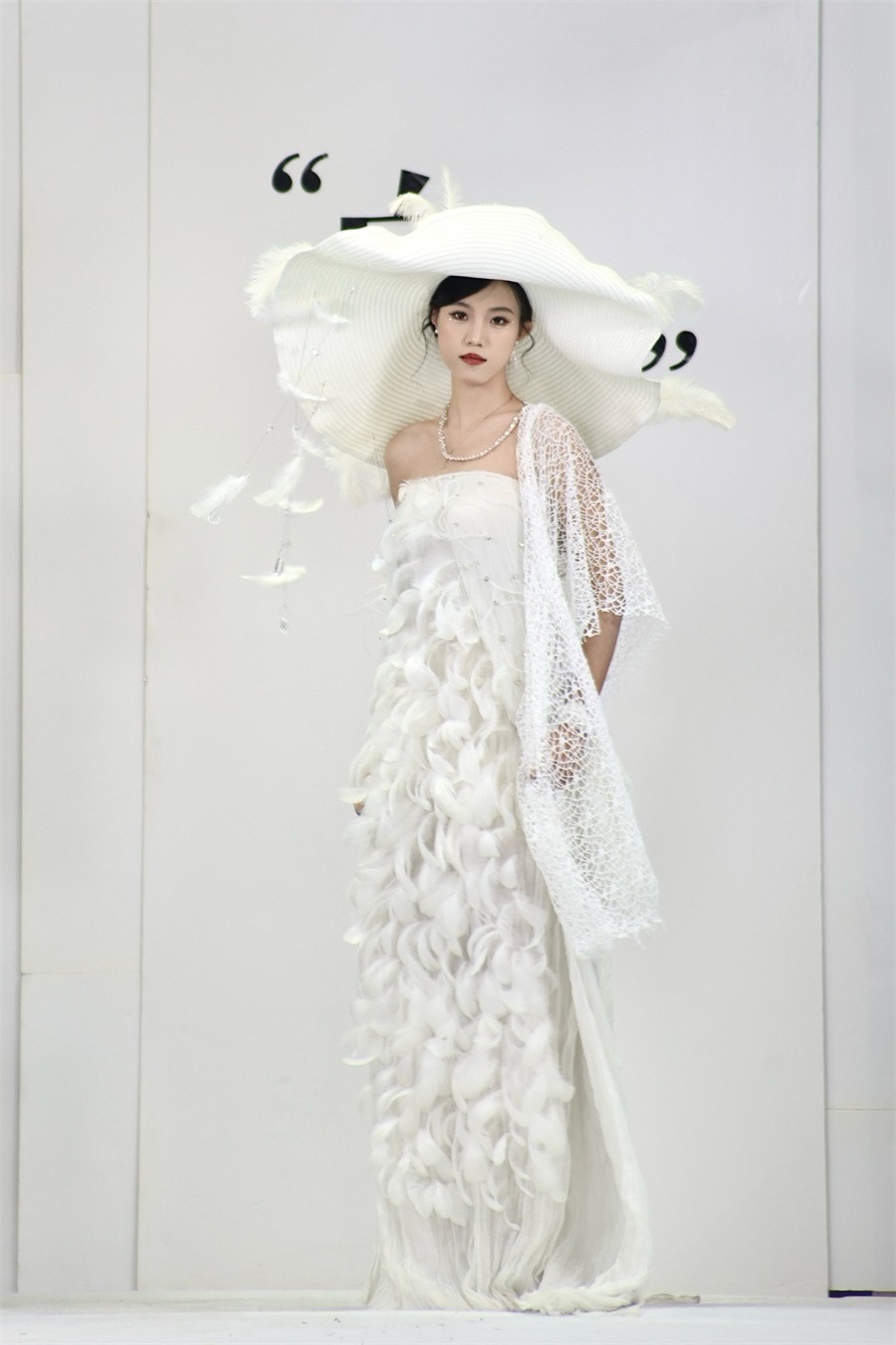 秀场结束后,2024级参展学生黄诗琪分享了其设计灵感。她表示,本学期的学习让她注重审美、理论与实践的结合,创作出既美观又实用的服装。此次设计主题为“白梦”,寓意着纯洁与无限可能。她希望作品能唤起人们对美好生活的追求,并表达简约个性的生活观。在材料选择上,她强调可持续性,用天然纤维和回收的快递包装袋,使废弃塑料制品重获新生、物尽其用,让观众在欣赏设计的同时,也能感受到对环境的尊重和保护。
