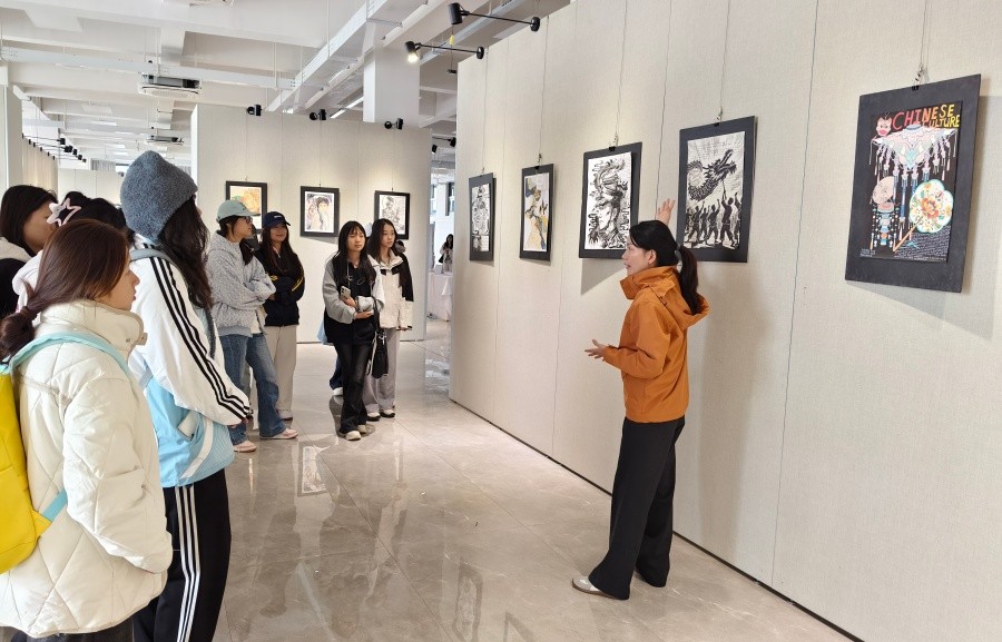 此次展览共展出2024级学生的220幅优秀作业,涵盖8个主题,包括中国传统文化、爱国主义、中国智造、年轻一代、体育、大学校园、广西非物质文化遗产和魅力北海。在作业中,学生将本土文化、社会议题或专业领域的独特视角融入英语表达,例如用英语阐释中国传统文化符号、当代社会发展或科技创新成果,使英语不再局限于西方语境,而是成为承载全球多元文化的载体。这种“文化翻译”过程丰富了英语的表达内涵,使其更具包容性与时代感。现场合影